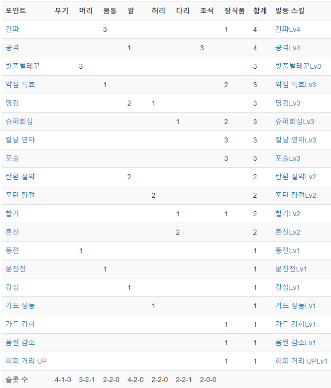 최종적인 스킬 세팅은 첫번째 커스텀과 동일합니다. 공격7까지+간파를 넣을 수 있을만큼 최대로(아니면 간파를 줄이고 광룡증+전화위복으로 가도 무방), 명검은 있으면 좋지만 칼날 연마3이 있으니 굳이 이중으로 챙기는 것보다 다른 스킬을 더 챙기는걸 추천.