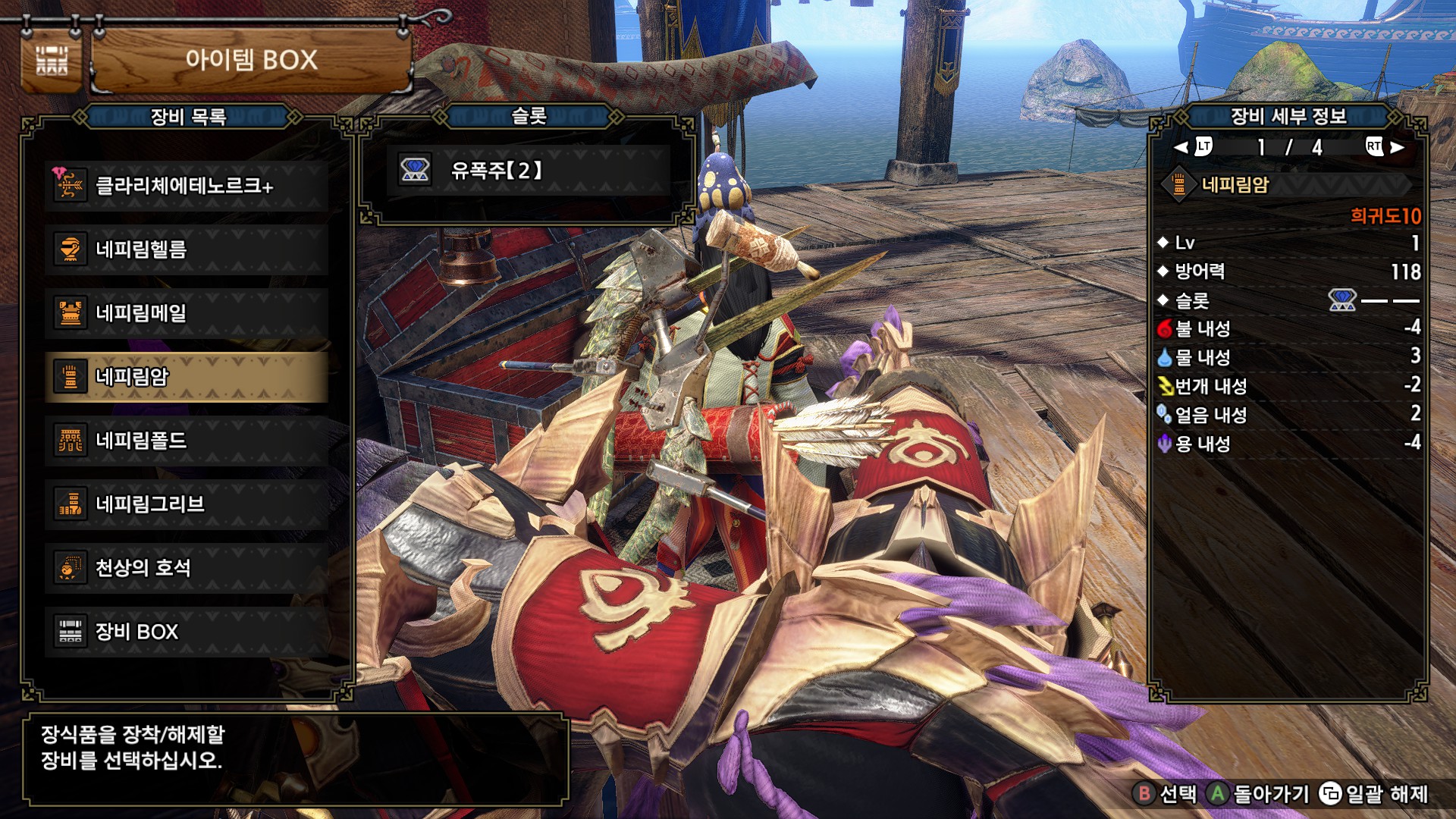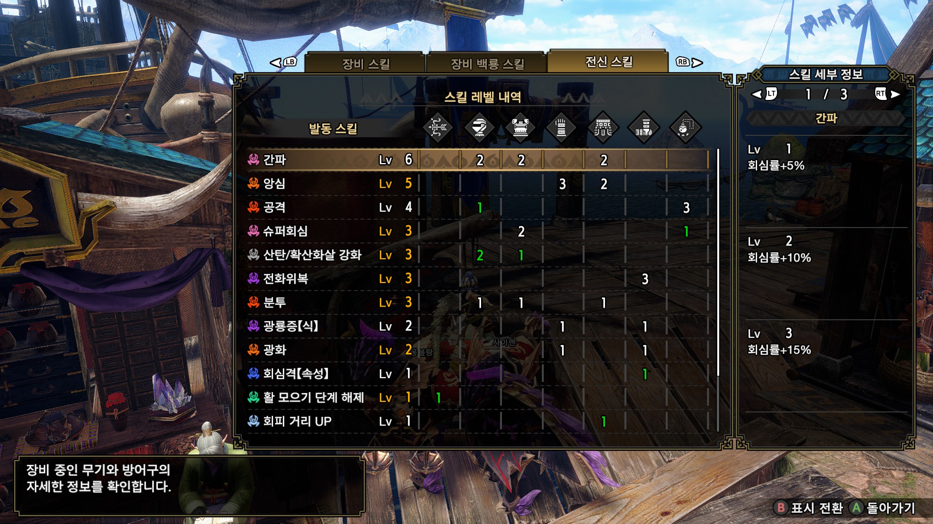 나머지 회심은 파이트 아이루로 챙기는 게 가장 편하면서 쉬운 길이고, 그게 아니면 간파1렙을 추가로 달아서 회심 85%에 약특1을 다는 방법도 있습니다. 일반적으로 백룡 장식주는 강혼룡주보다는 특효주가 약간 좋고, 속성 육질이 25 이상인 몹에 한해서 속통룡주가 좋습니다.