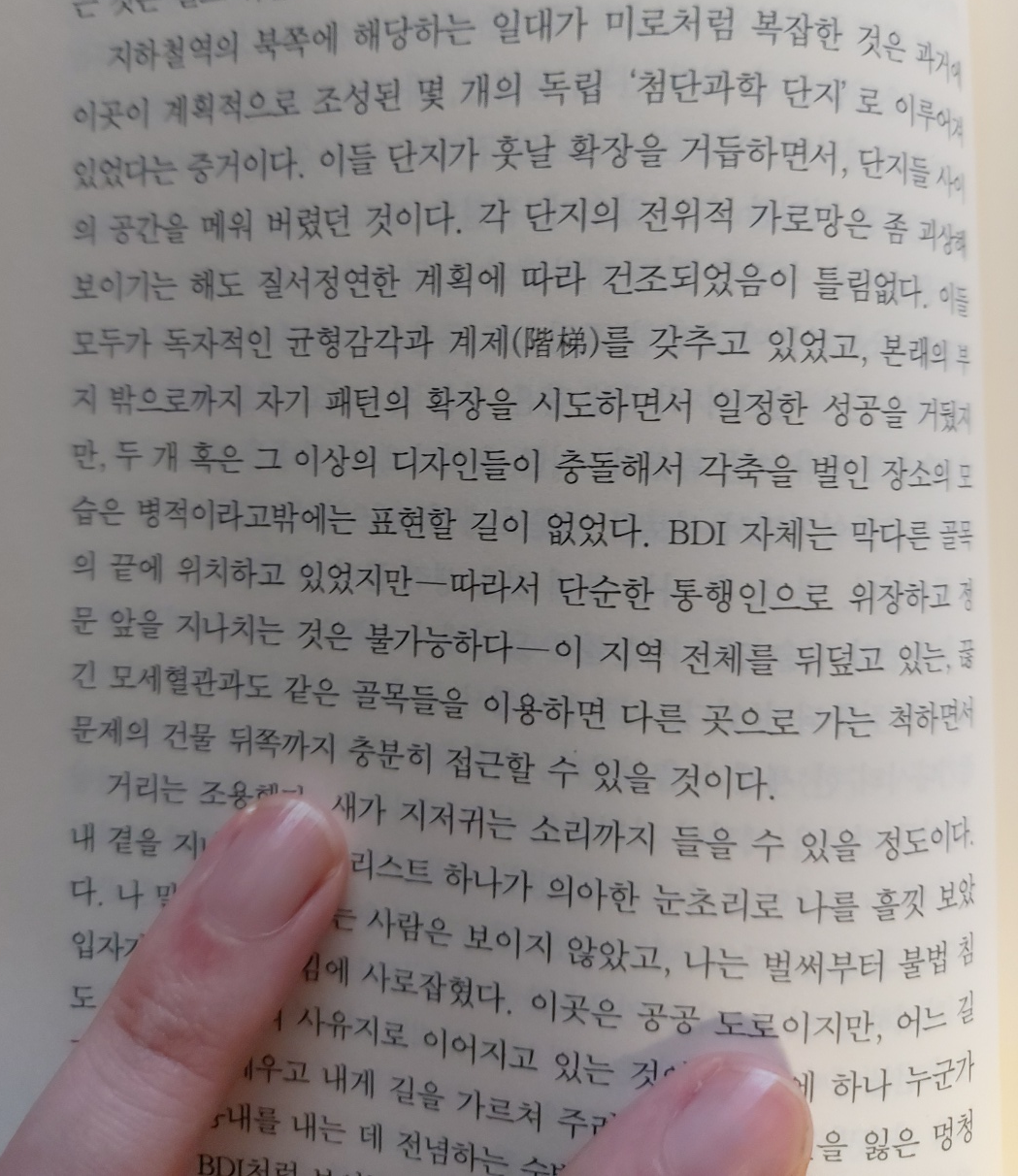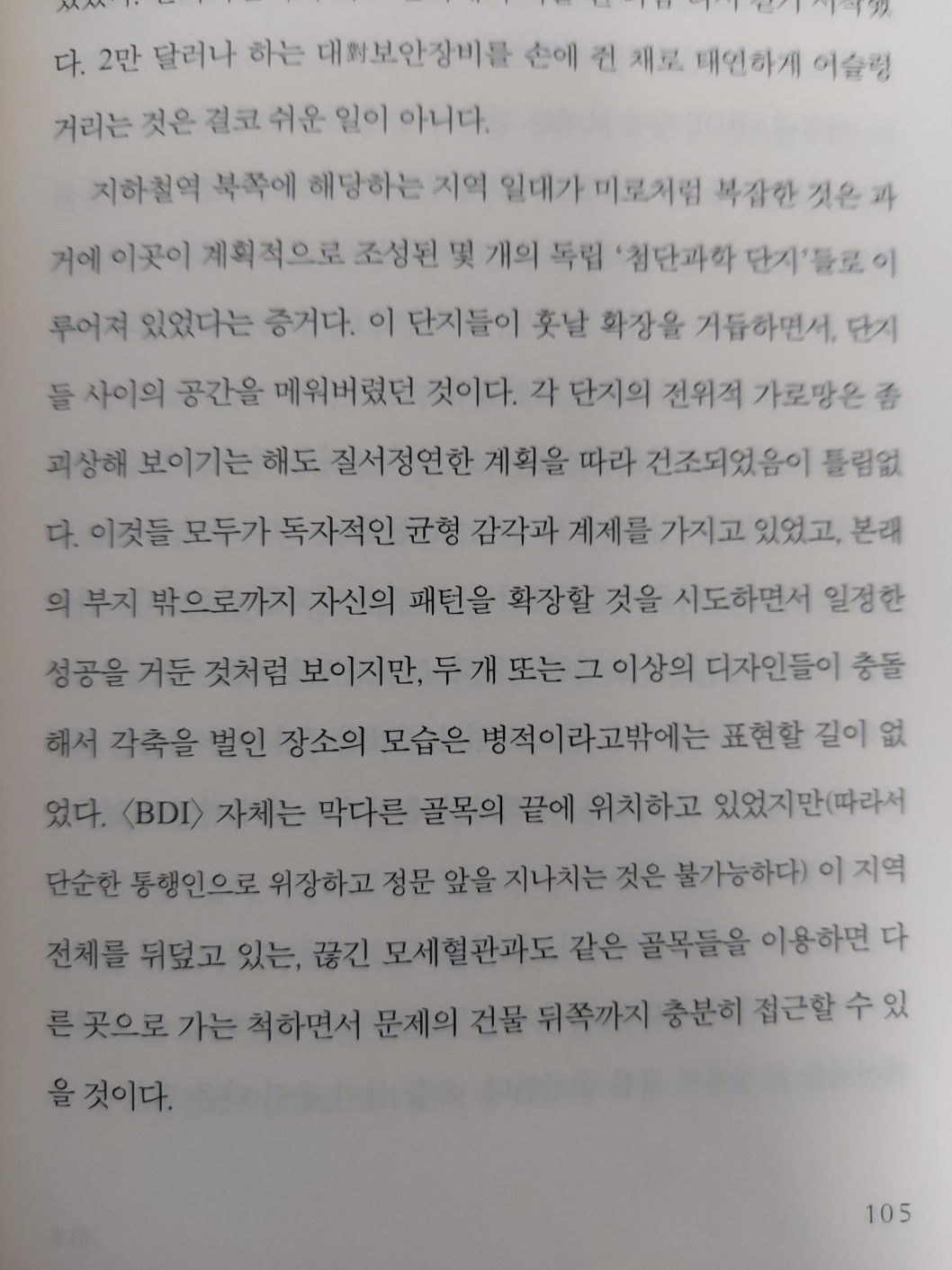 본래의 부지 밖으로까지 자기 패턴의 확장을 시도하면서 일정한 성공을 거뒀지만, 두 개 혹은 그 이상의 디자인들이 충돌해서 각축을 벌인 장소의 모습은 병적이라고 밖에는 표현할 길이 없었다. BDI 자체는 막다른 골목의 끝에 위치하고 있었지만 ㅡ 따라서 단순한 통행인으로 위장하고 정문 앞을 지나치는 것은 불가능하다ㅡ