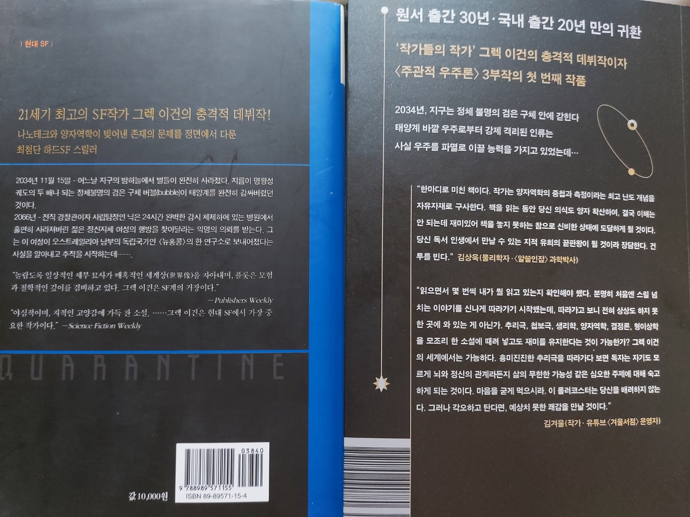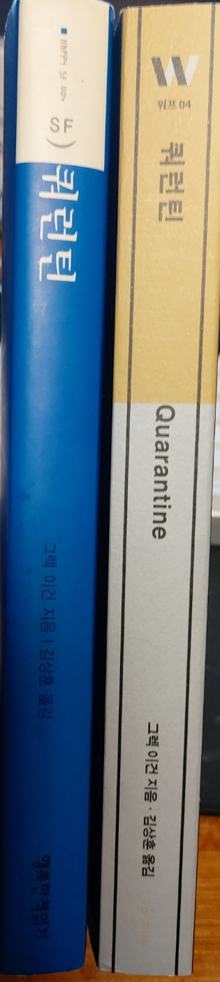 행책 sf총서 표지는 거의 다 이런 식입니다. 그나마 쿼런틴은 괜찮았던 편(?)입니다. 여담이지만 해당 출판사는 펀딩 문제로 몇번 말이 나왔음에도 불구하고, 스리슬쩍 넘어가던데..구경하는 입장에서 너무 신기했던 기억이 나네요.