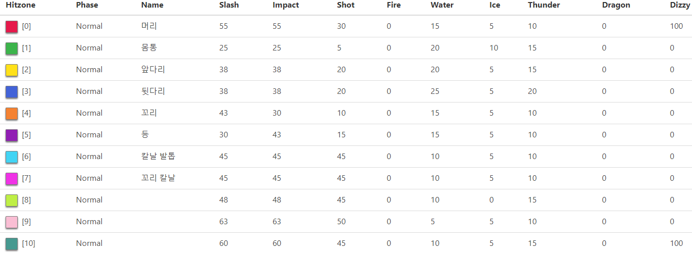 위의 표를 참고하면 히트 박스 컬러링 때문에 좀 헷갈릴 수 있습니다. 뭔가 색깔이 맛이 갔는데? 이상한데? 싶으신 분들은 해당 부위만 활성화 시킨 아래의 표를 봅시다.