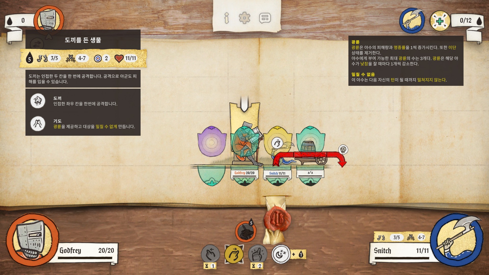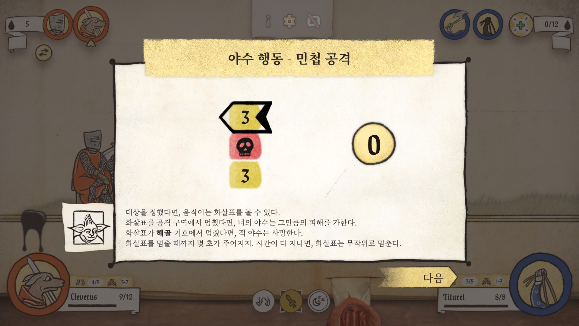 공격 명령을 내리면 일정한 수치가 입력된 칸을 화살표가 싸돌아다니게 되는데, 타이밍에 맞춰 클릭을 하면 해당되는 수치만큼의 공격력으로 적을 공격하게 됩니다. 해골표시는 확정 사망.
