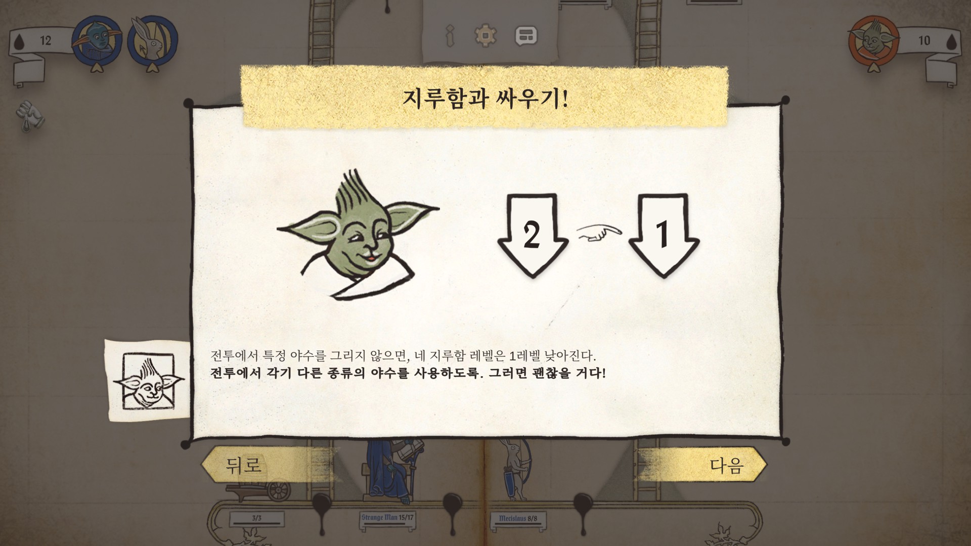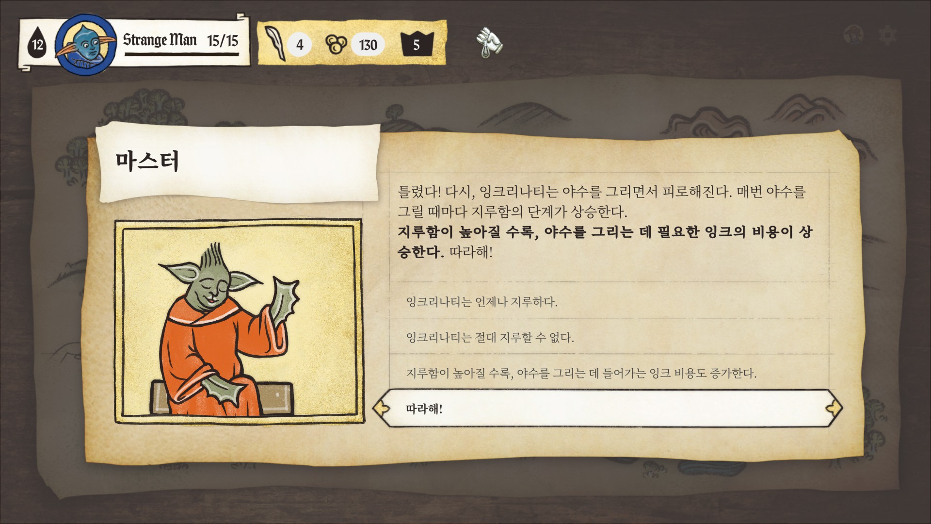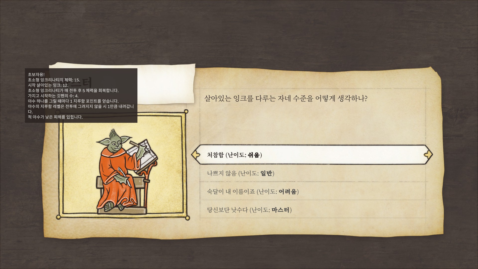 튜토리얼을 시작하면 요다 비스무리하게 생긴 고블린이 세계관과 시스템을 반말로 친절하게 알려줍니다.