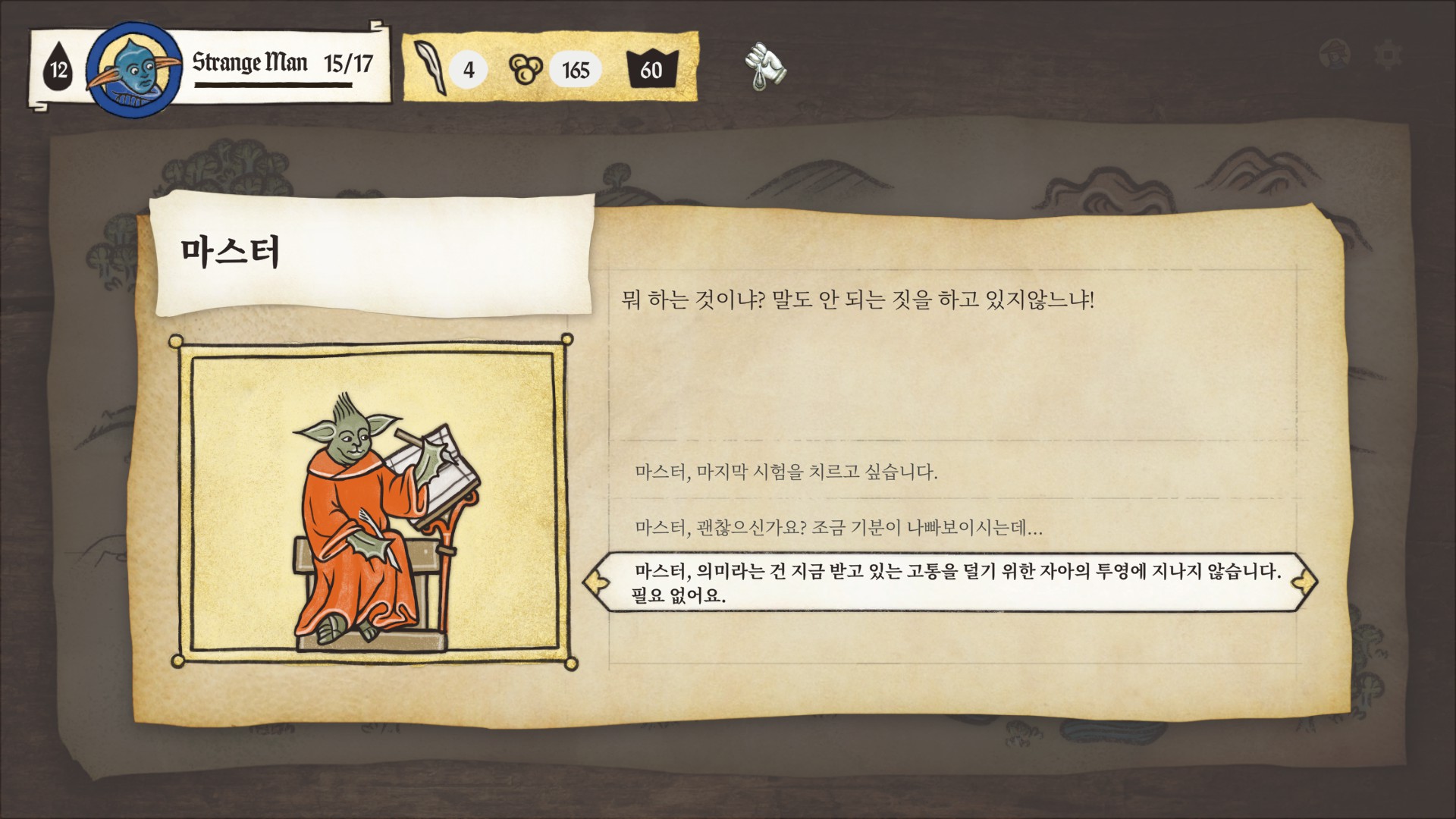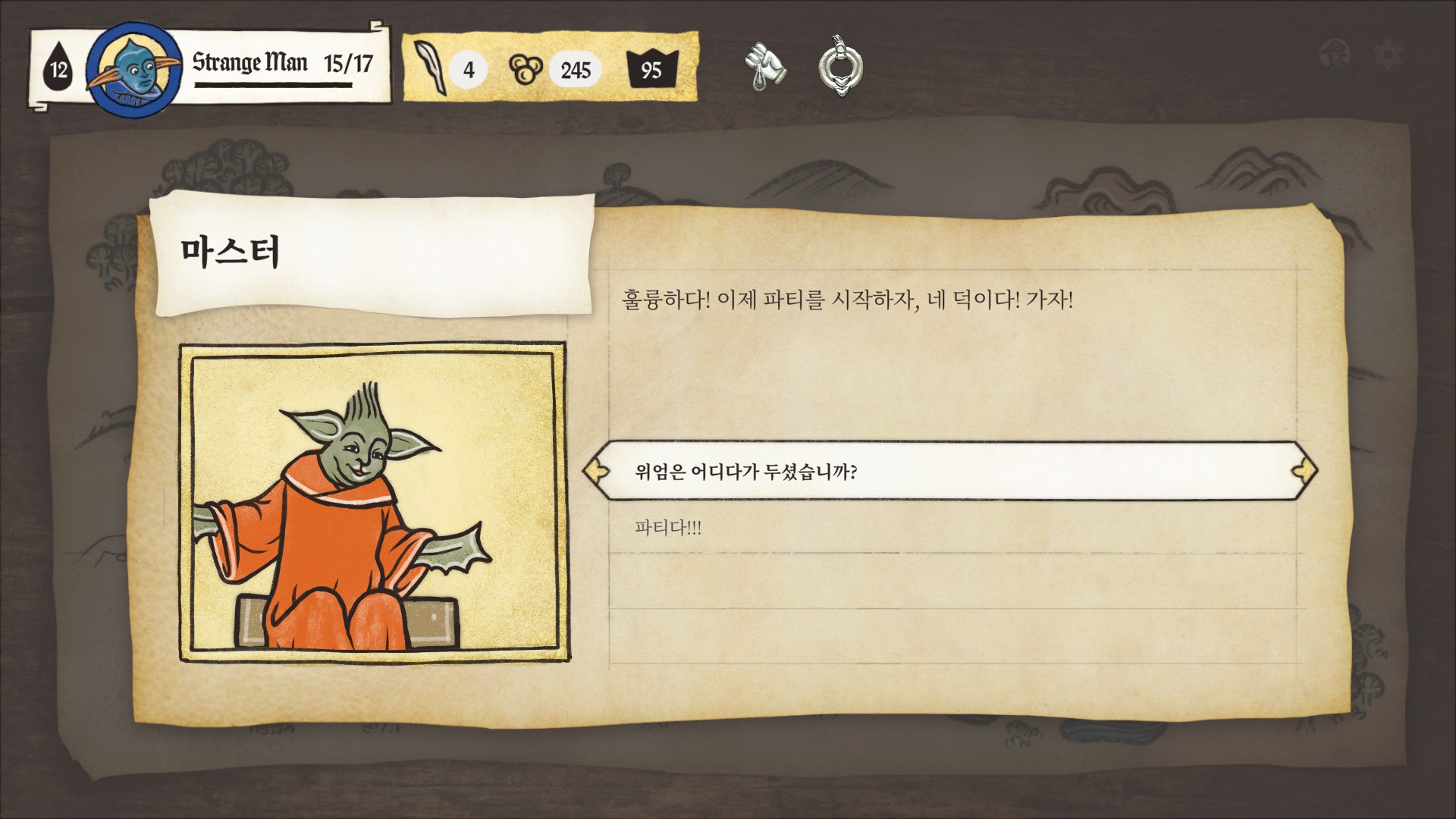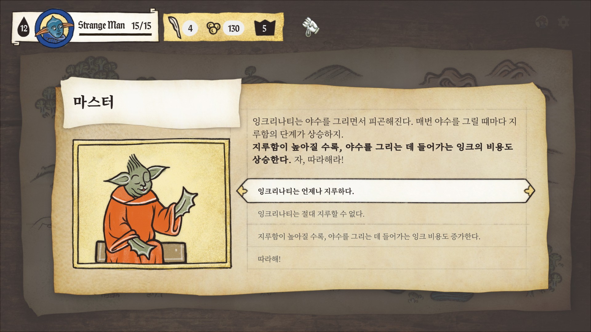 튜토리얼을 시작하면 요다 비스무리하게 생긴 고블린이 세계관과 시스템을 반말로 친절하게 알려줍니다.