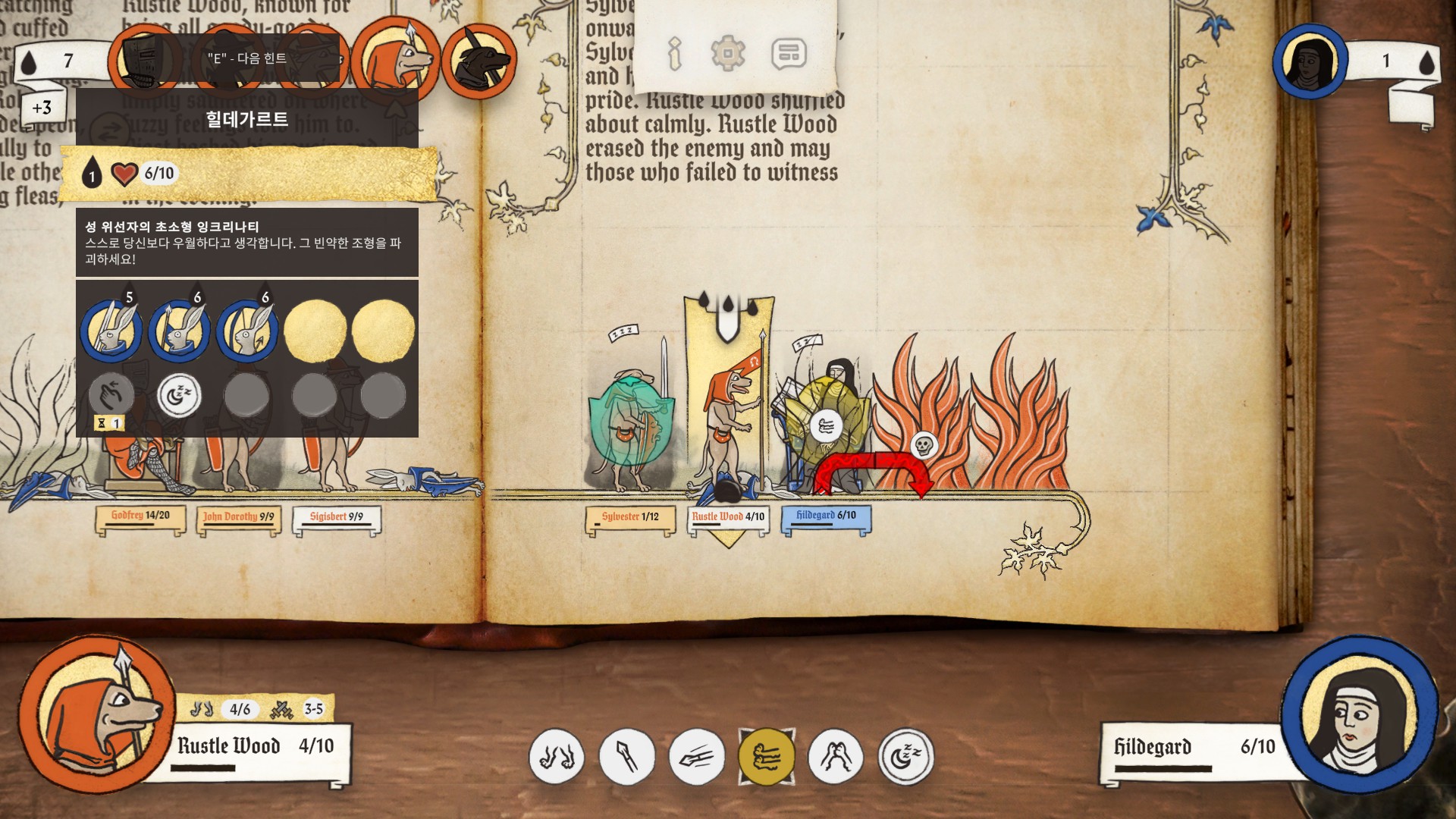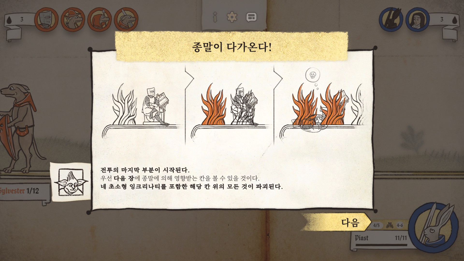 본편에서는 달라질 수 있겠지만, 기본적으로 매 전장의 규모가 거대하지는 않습니다. 그래서 한판 당 플레이 타임이 그렇게 길진 않은데, 거기에 더해 일정 턴이 경과하면 필드의 양끝에 지옥불(?)이 발화합니다.