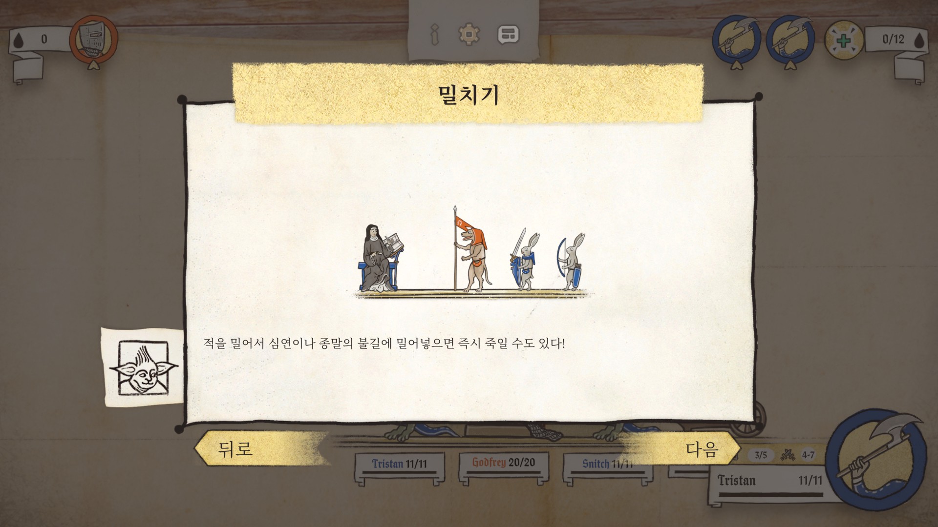 밀치기는 아군 야수나 적군 야수(선결 조건 필요) 임의의 방향으로 이동시키거나