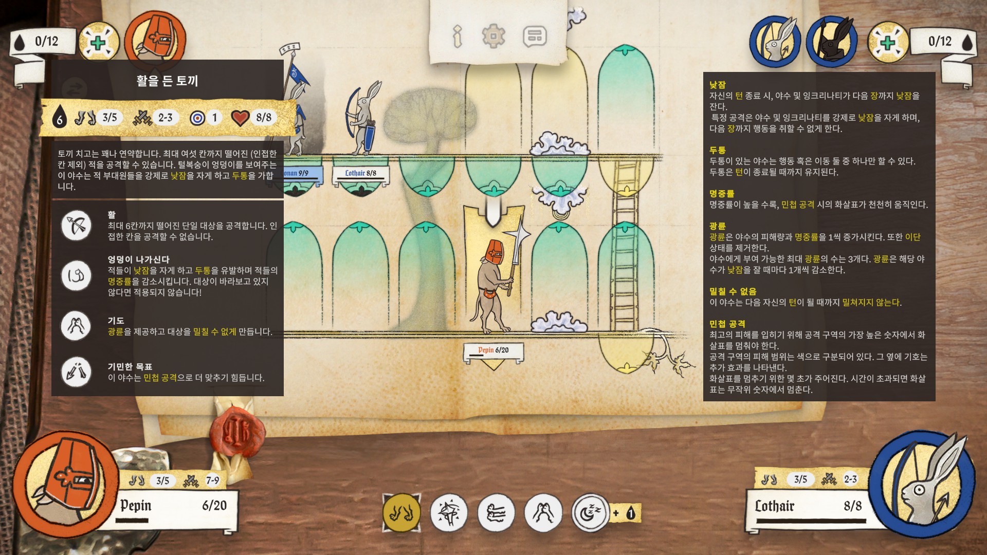 병사들은 초록색 칸까지는 이동후에 추가적인 명령(공격 등)을 이행할 수 있지만, 노란색칸까지 이동하면 바로 잠들어 버립니다.