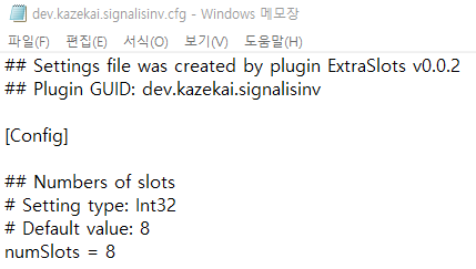 폴더 내 "dev.kazekai.signalisinv.cfg" 파일을 메모장으로 열어서, numSlots 뒷부분의 숫자를 임의로 변경하세요.