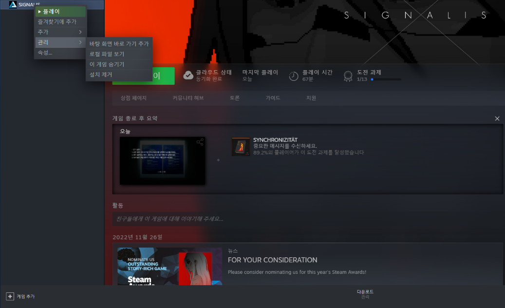 4. 시그널리스 게임을 실행한 후, 게임을 종료합니다.