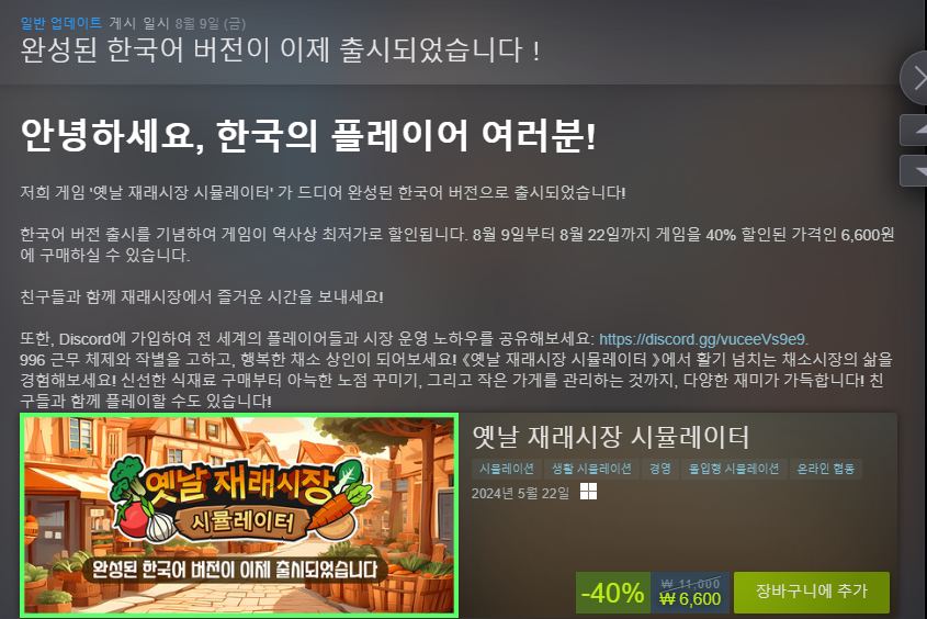 옛날 재래시장 시뮬레이터 상품을 Steam에서 구매하고 40% 절약하세요. (steampowered.com)