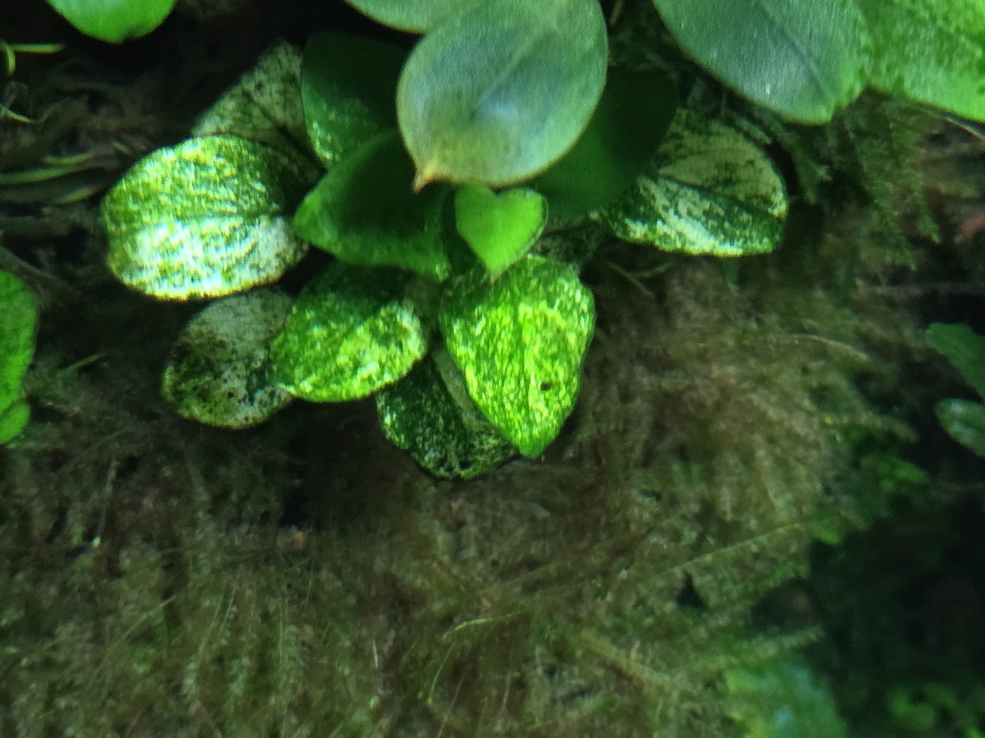 여담이지만 핀토는 아무래도 빛을 강하게, 오래 쏴줘야 백색 지분이 높은 신엽이 나오는 것 같습니다. (그런데 고광량+장시간 조명을 쏴 줄 경우 이끼가 우점할 가능성이 높아서, 유경수초를 잔뜩 식재하거나, 물고기가 적거나 없는+새우만 있는 환경이 필요할듯)