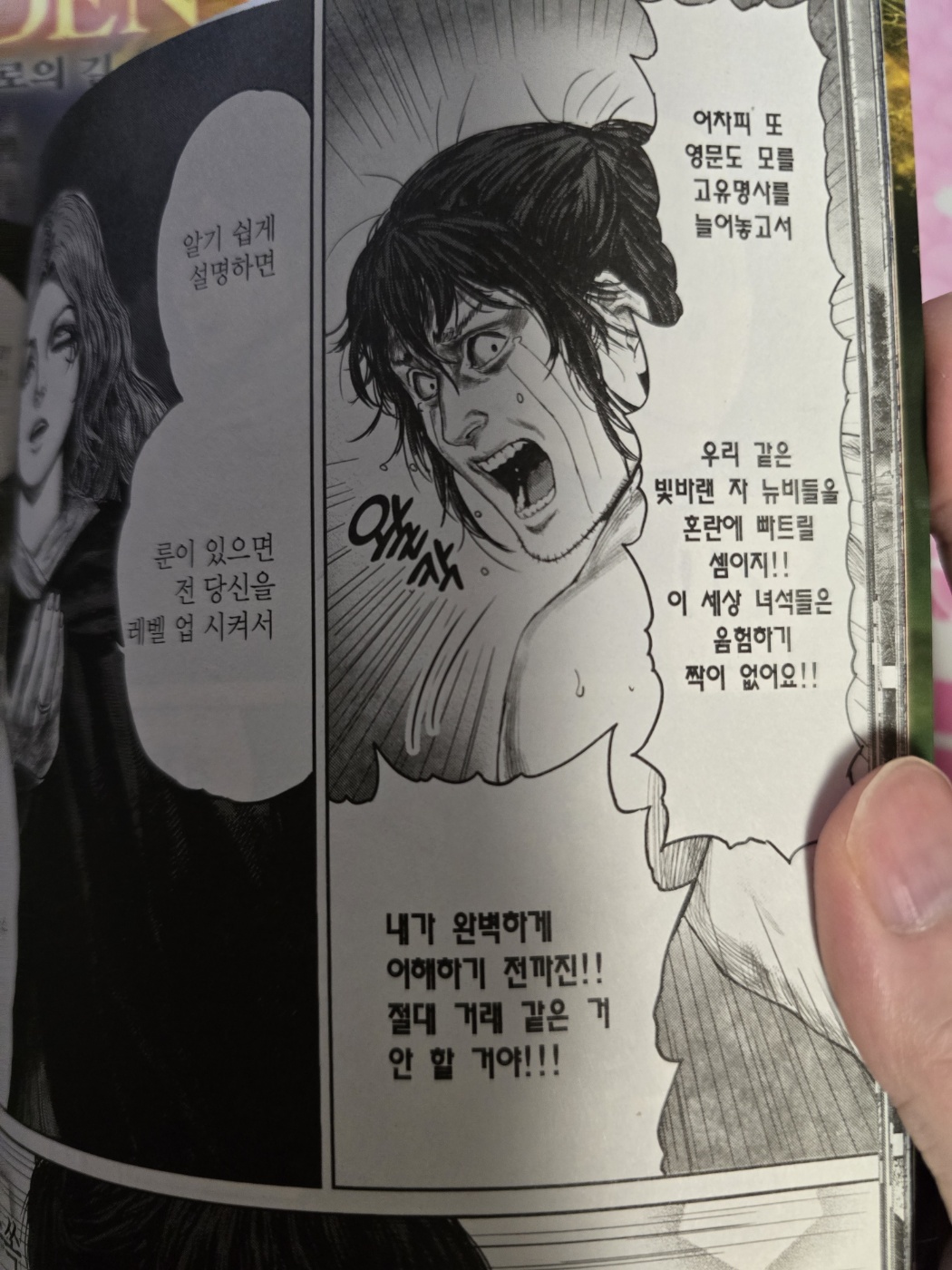 작가는 개그만화 사검씨를 그렸던 사람이라 엘든링과 잘 어울릴지 걱정이 됐었다. 코믹스판의 장르는 당연히 개그지만, 장르와는 별개로 원작 스토리 고증이 꽤 충실한 편이다. 등장인물들의 특징+작가 특유의 정신나간 설정도 볼만해서 전반적으로 게임팬이라면 무리없이 볼 수 있는 만화라고 생각한다.