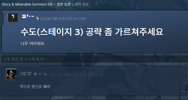어째선지 스팀 커뮤니티에 올라온 한글 질문글이 나온다. 보다시피 딱히 도움은 안되는 답변이 끝.