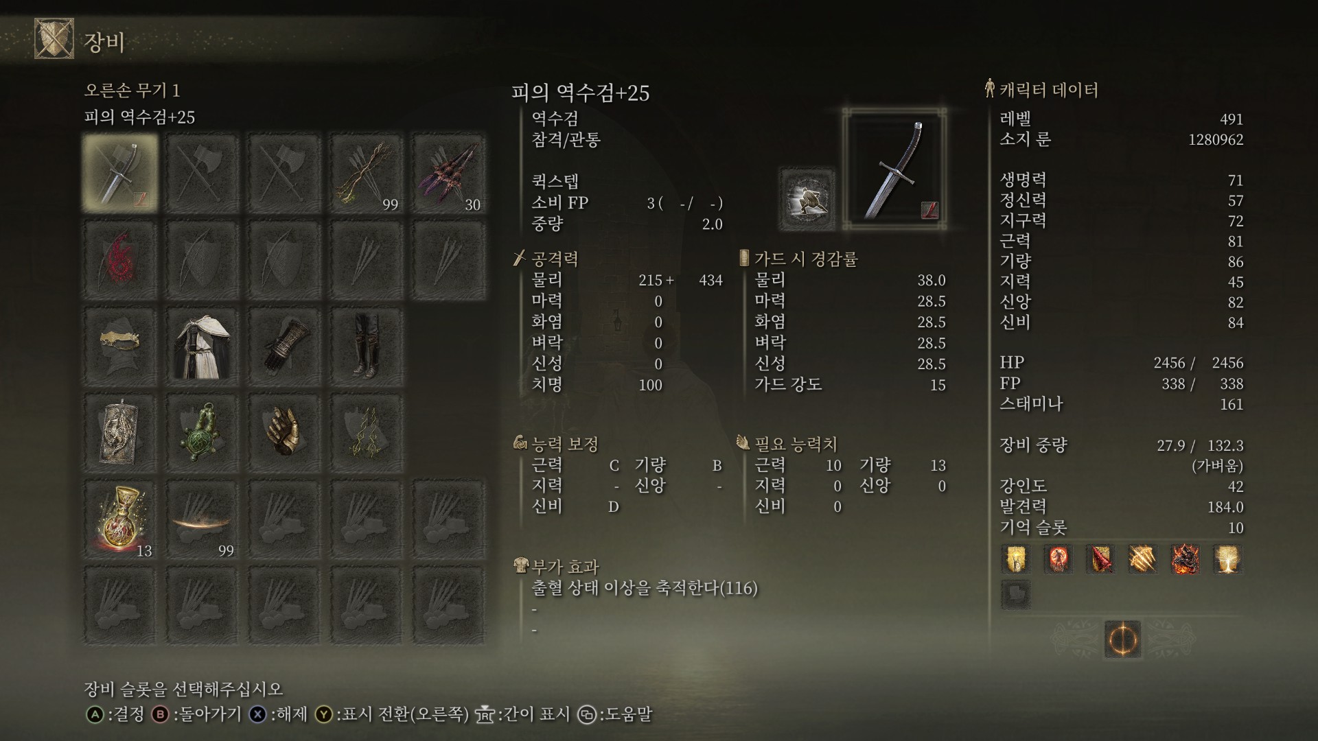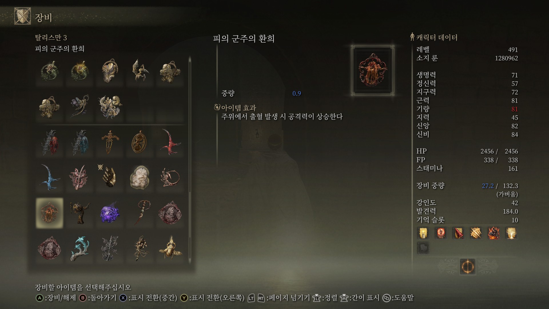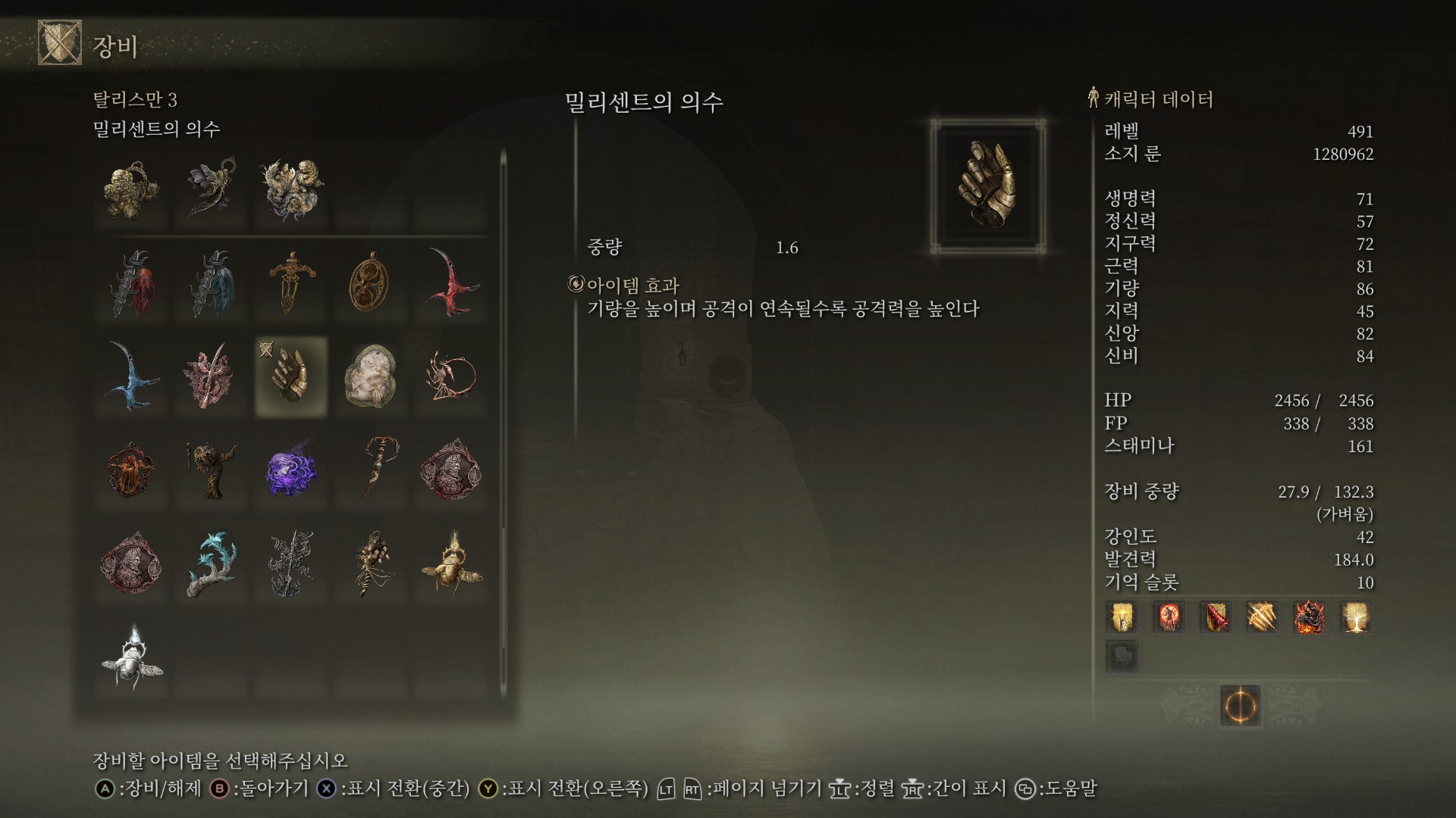 나머지 3칸은 용대방, 쌍거북, 부패 익검의 휘장, 피의 군주의 환희, 밀리센트의 의수 등을 추천드립니다.