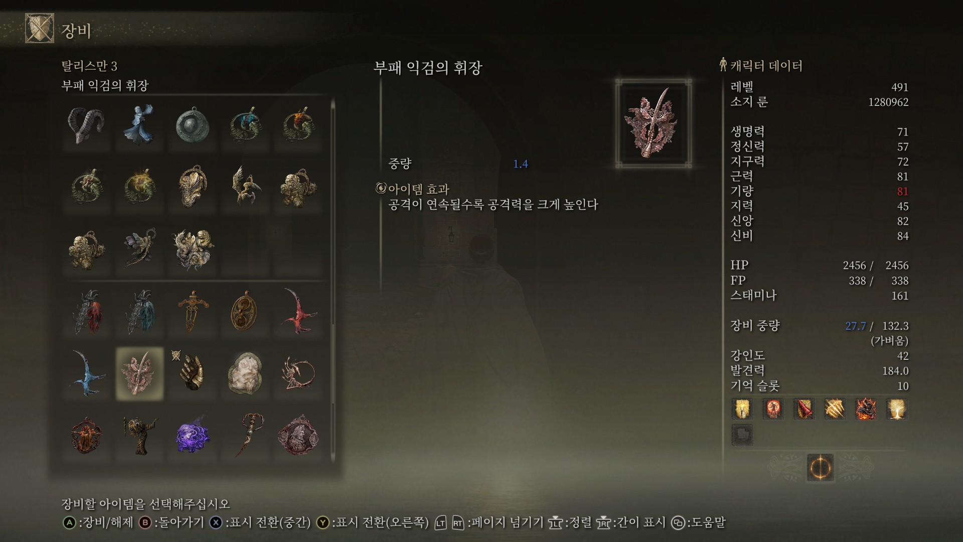 관통 판정을 고려해서 창의 탈리스만을 쓸 수도 있겠지만, pve에서는 효율이 안좋습니다