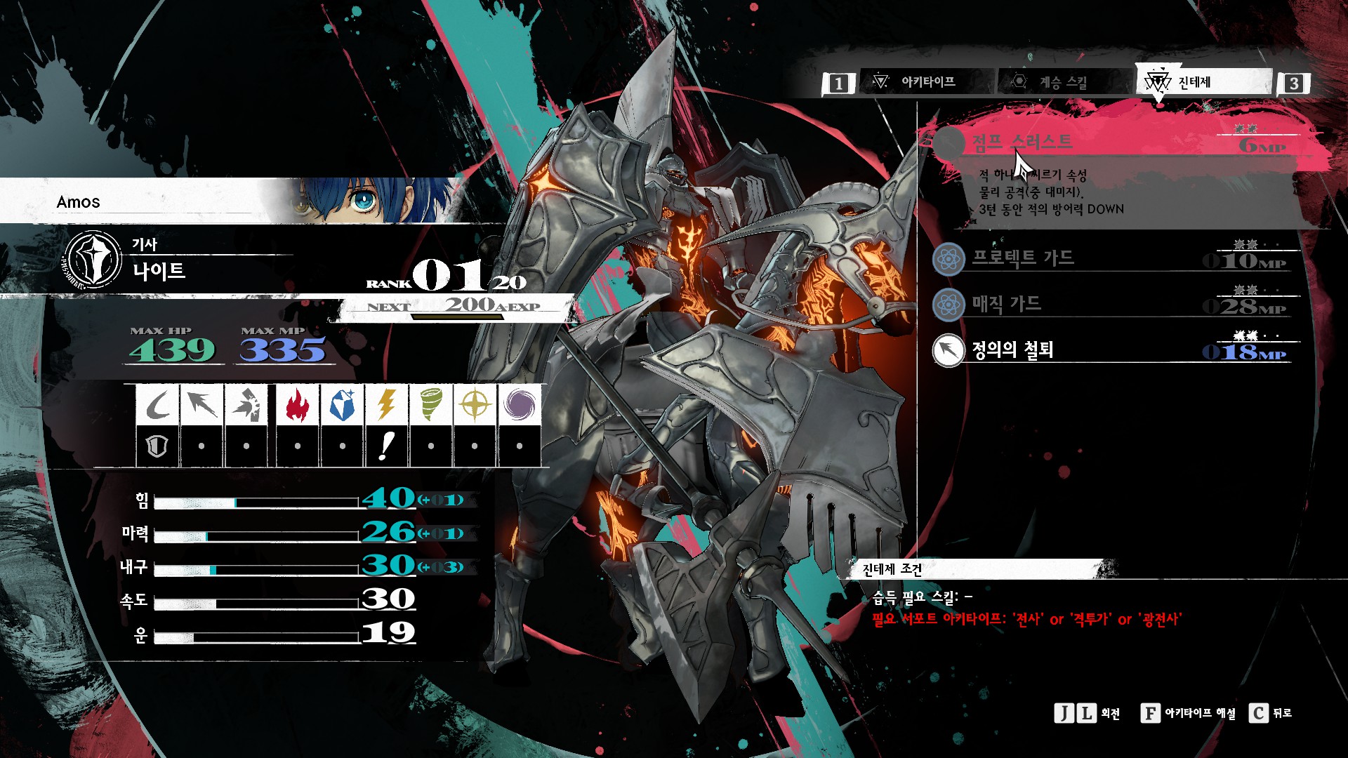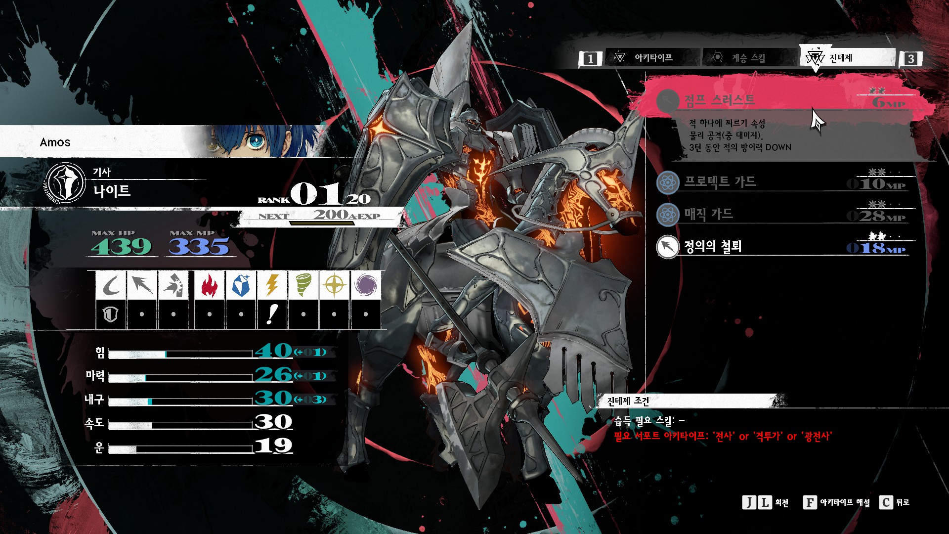 초반에 맹활약하는 기사의 포고, 딜을 놓으면서 동시에 디버프를 거는 점프 스러스트 등 보유. 여러모로 좋은 아키타입입니다.