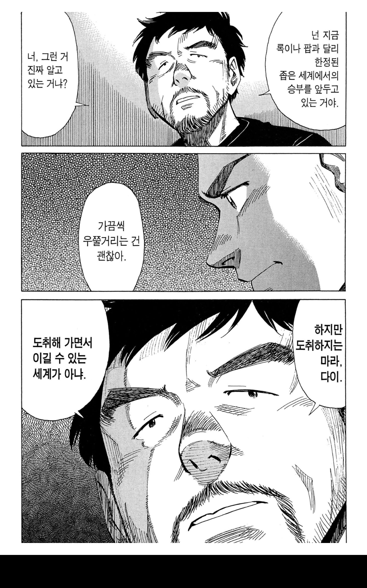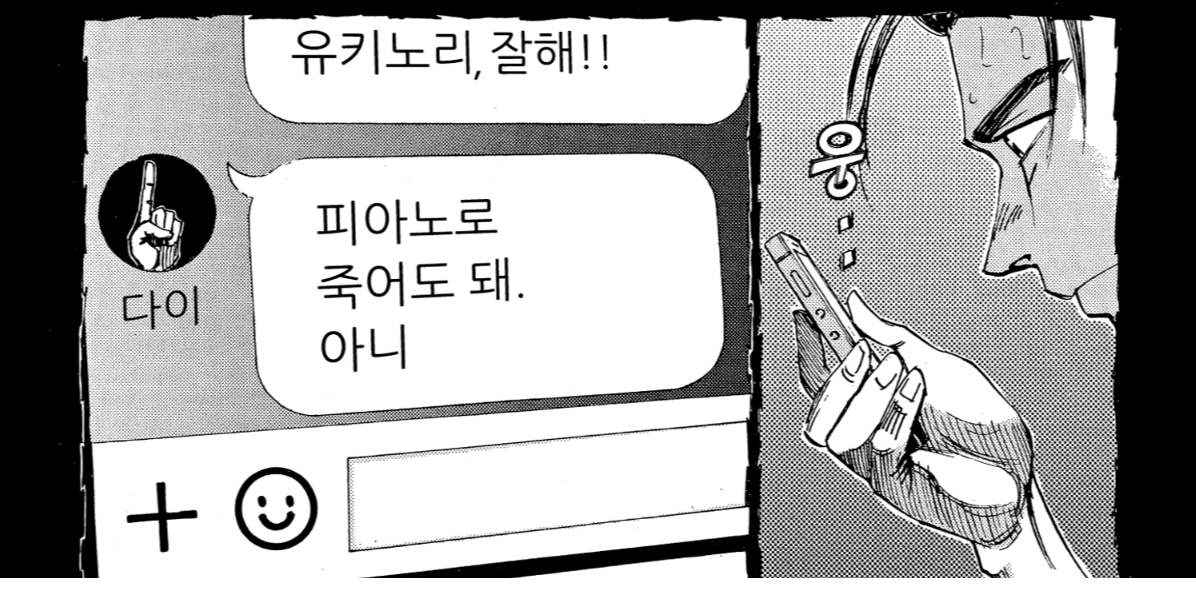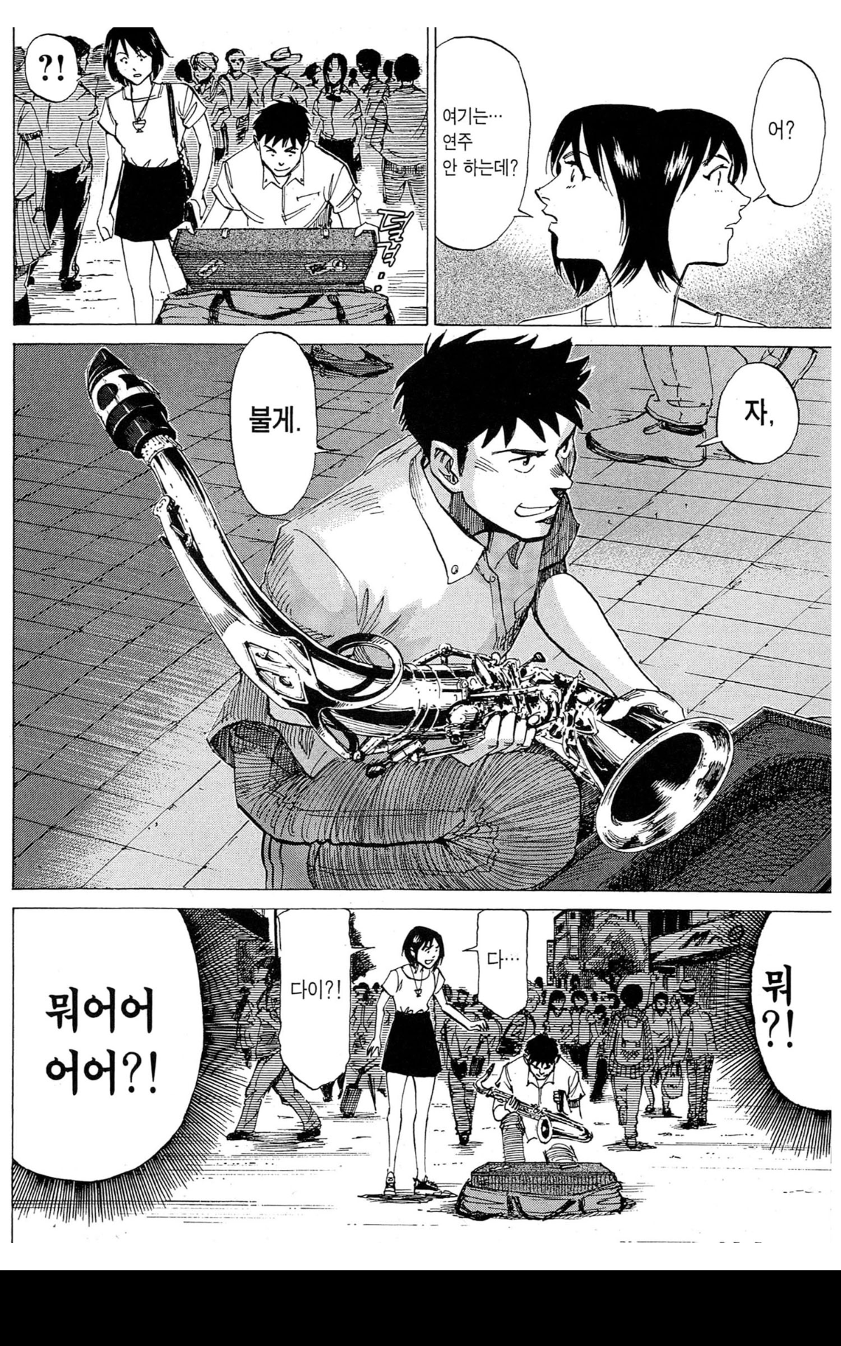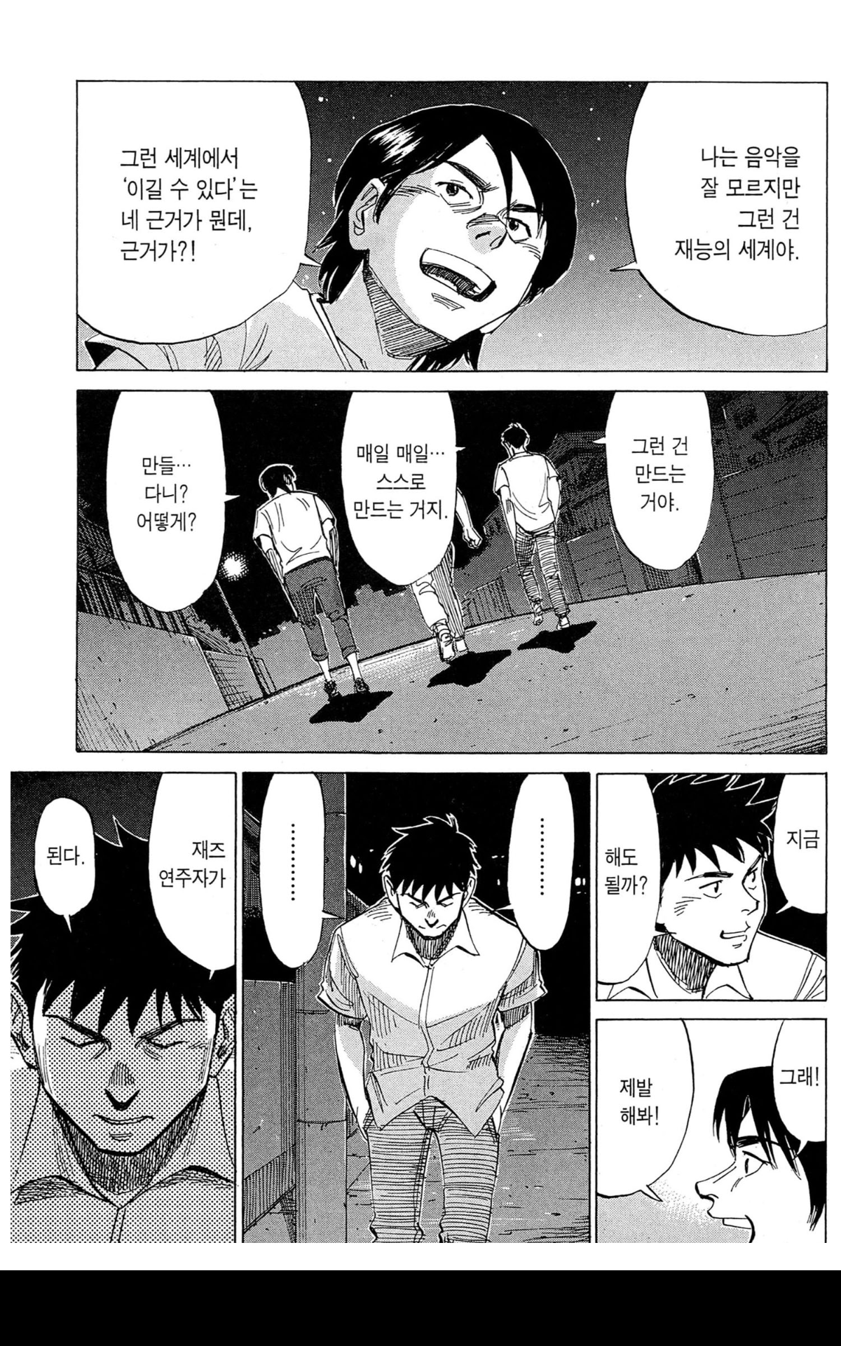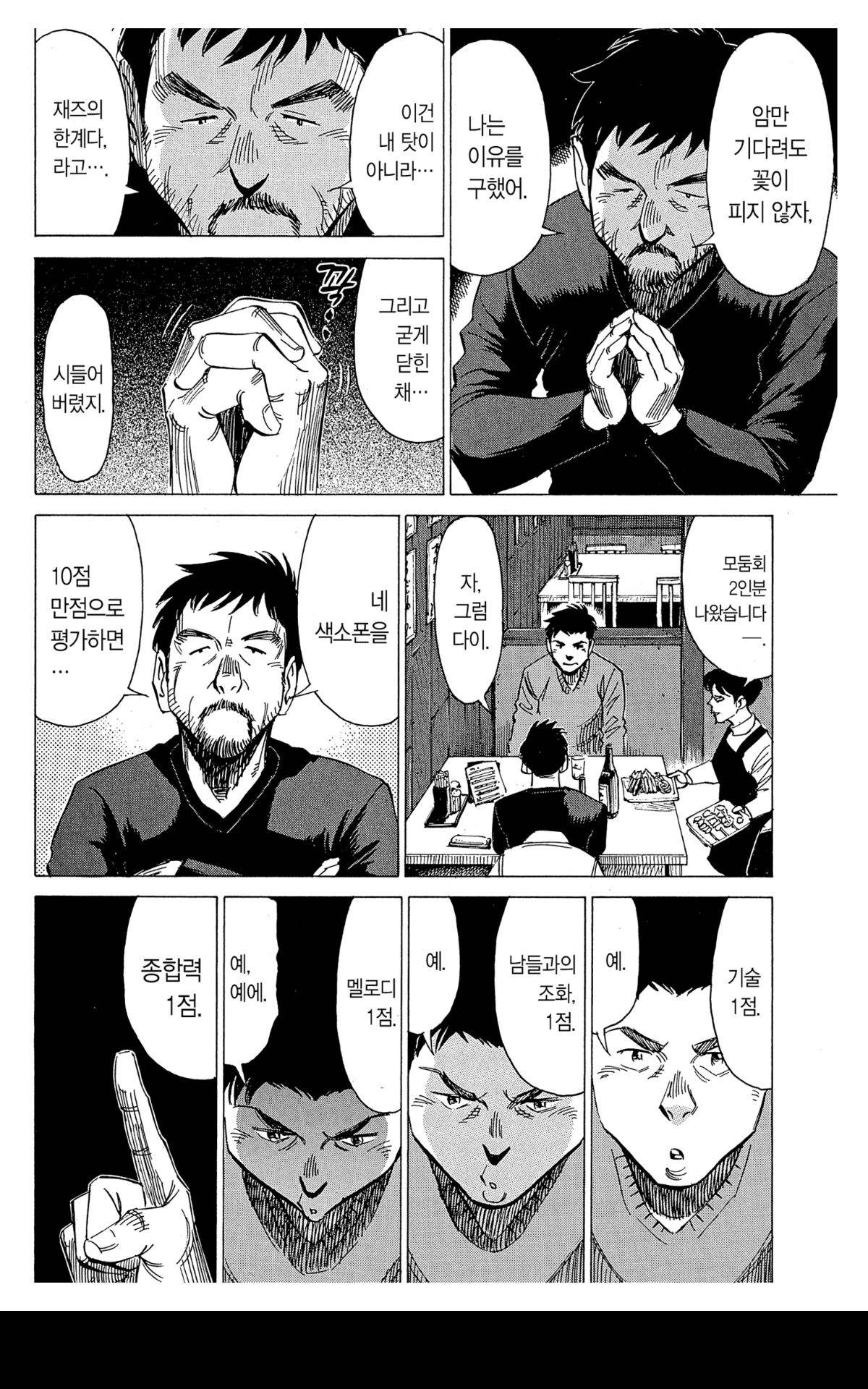 만화로는 소리를 들려줄 방법이 없다. 매체의 한계 때문에(원곡을 작품에 등장시킨다면 조금 다르겠지만) 독자는 작품 내에서 묘사하는 그 대단한 소리가 뭔지는 도저히 느낄 수 없다. 그래서 음악을 소재로 다루는 만화는 연출로 독자의 감정을 자극할 줄 알아야 한다고 생각한다.