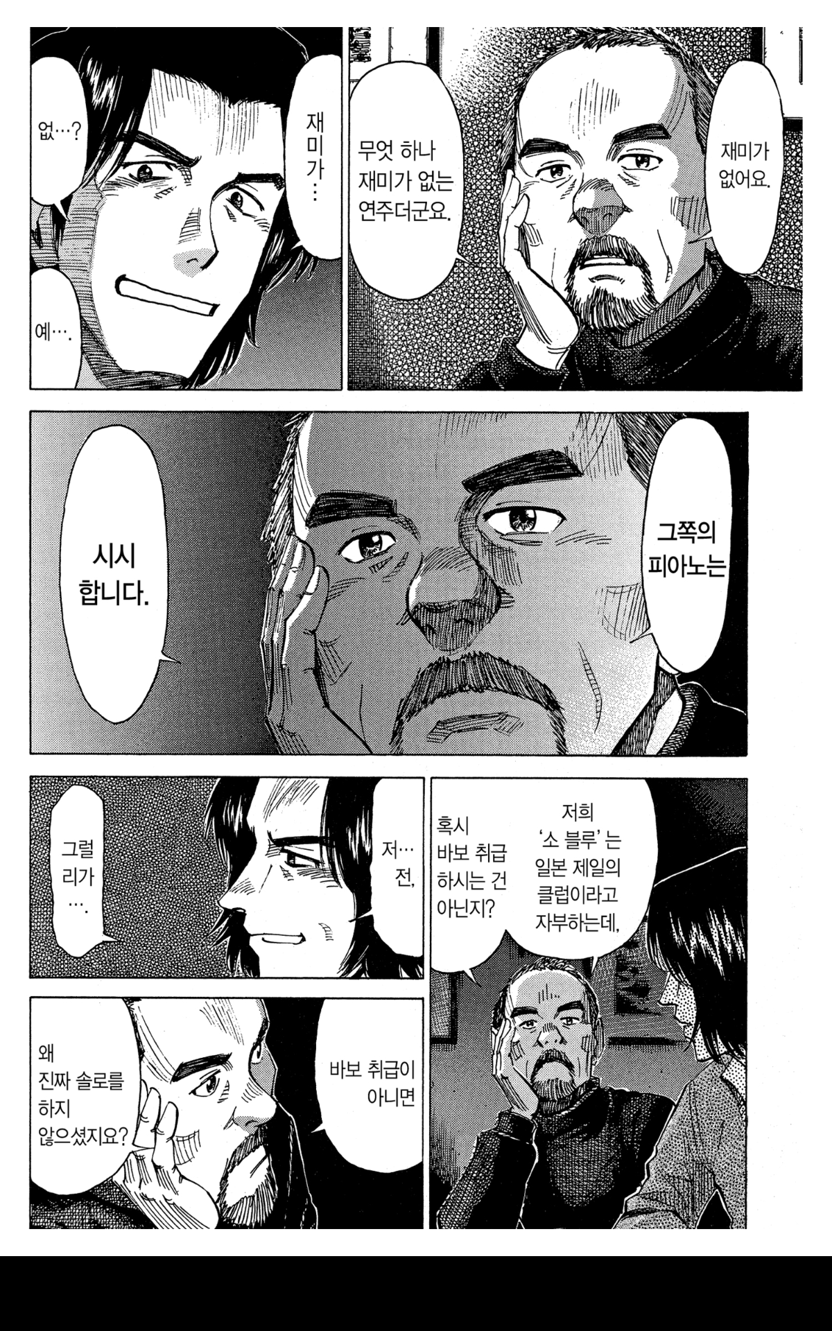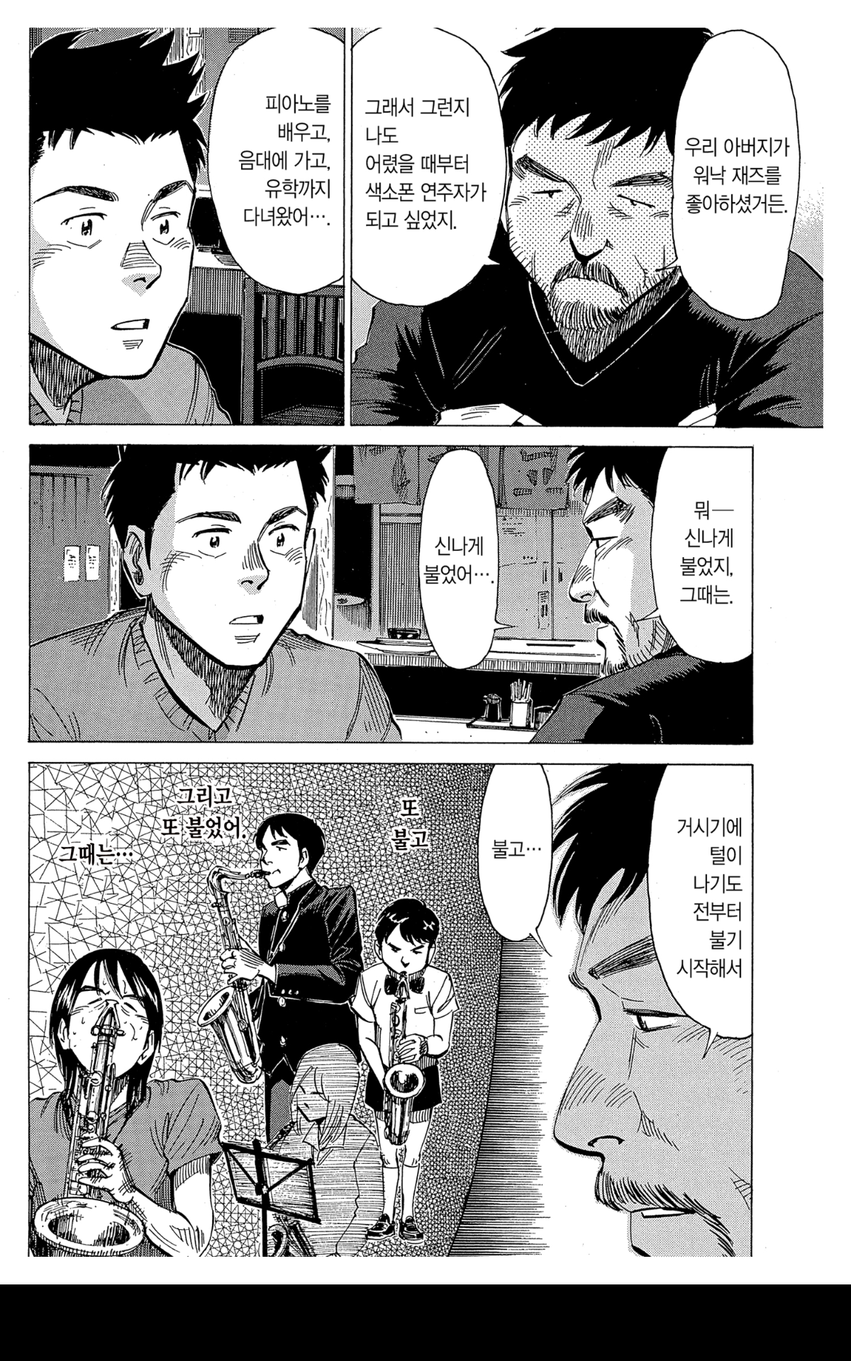 아주 가끔 말로 표현하는게 불경하게 느껴질 정도로 좋은 음악을 발견할 때가 있는데, 이 만화에서 대단하다고 묘사되는 소리를 들을 수 없다는게 너무 아쉽다. 그래서 이 소리를 표현한 애니메이션을 보고 싶은데...상영관이 없다는게..