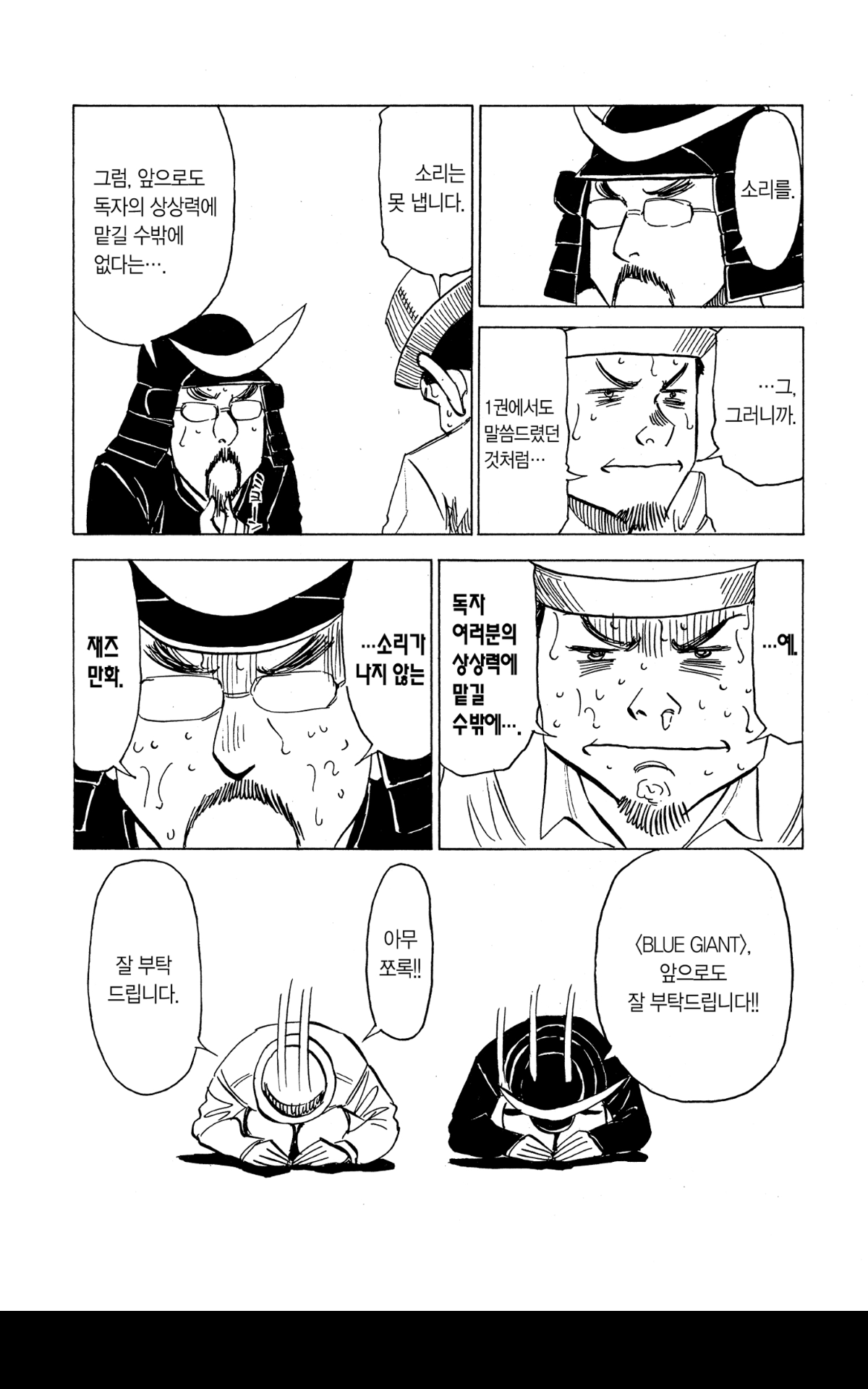 결국 만화로써 재밌냐 없냐와는 별개로 음악 만화는 '내가 들을 수 없다'는 점이 항상 아쉬운 부분이다. 이는 소리가 나지 않는 재즈 만화, 블루 자이언트에게도 그대로 적용된다. 물론 만화 자체는 굉장히 재밌게 읽어서 언젠가는 애니메이션을 보러 갈 생각...이었는데 상영 극장이 없다는게 아쉬울 따름이다.
