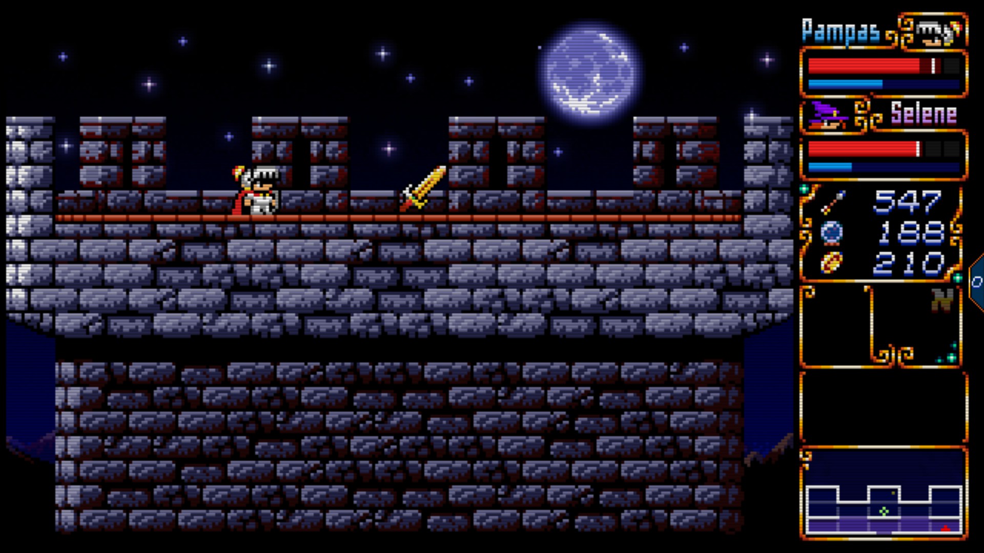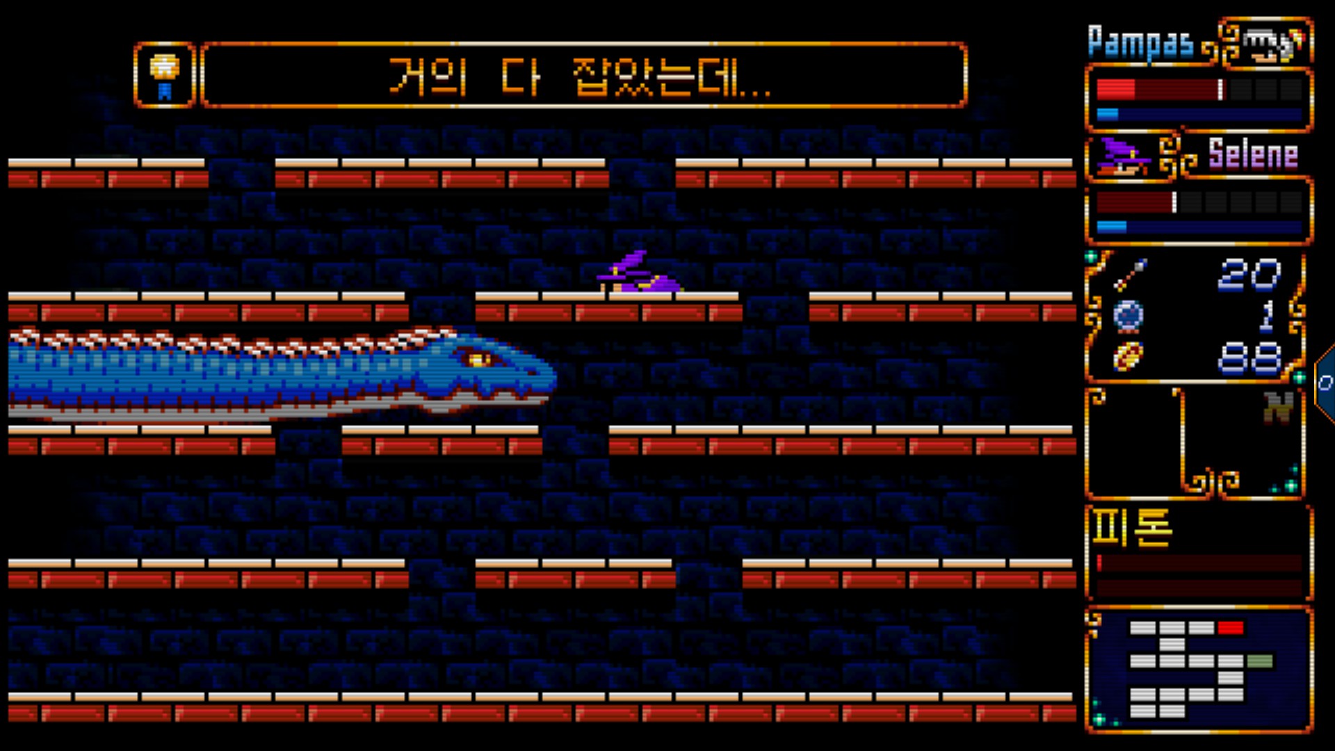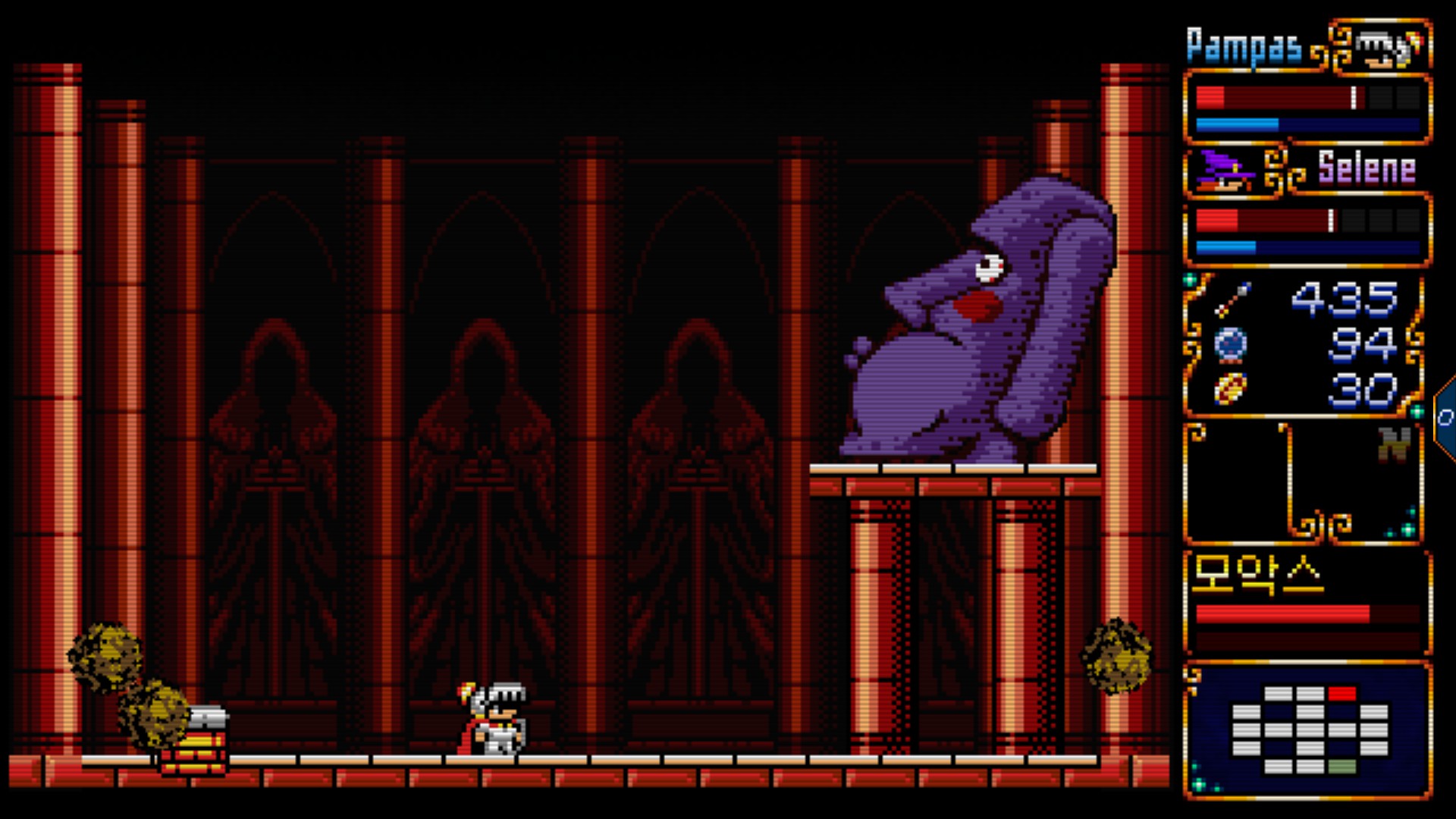 여튼 팜파스 앤 셀레네는 마성전설 2편의 오마쥬라고 하는데, 플탐은 과하게 길지도 않고, 짧지도 않다. 맵 탐험하고 아이템 파밍만 해도 깔끔하게 끝나는 느낌으로 즐길 수 있다. 물론 메트로배니아 장르의 플탐에 대해 계엄령을 내리려는 플탐 대통령이 있을 수도 있겠지만..