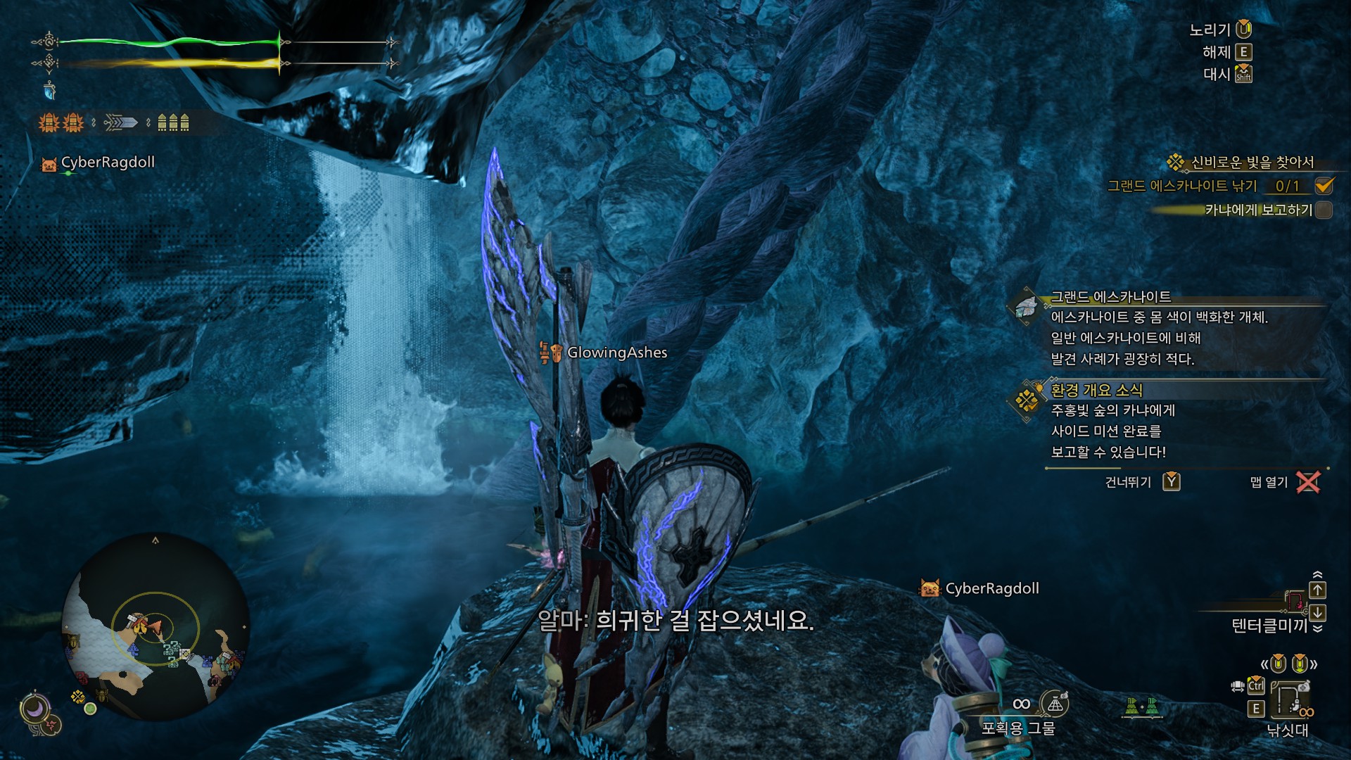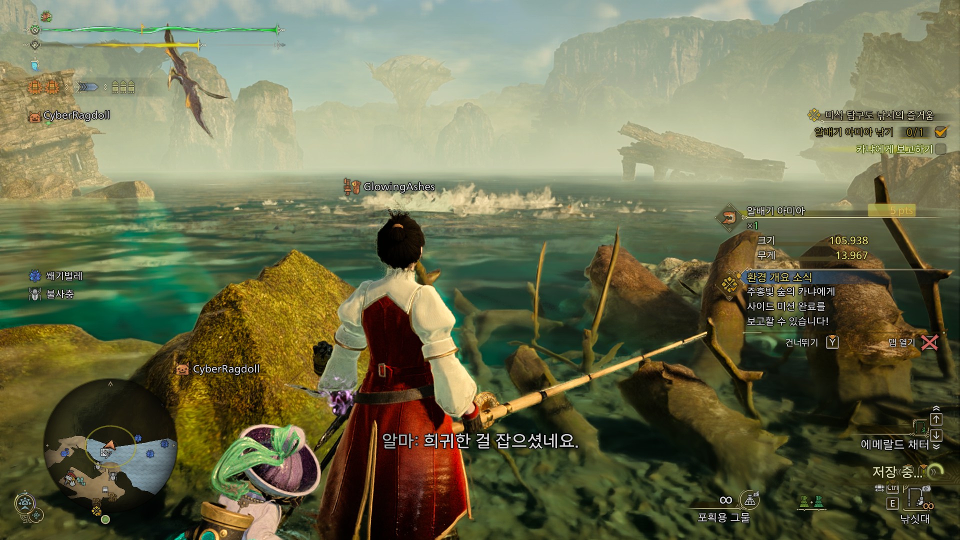 알배기 아미아는 카냐 말대로 아무 지역에서나 보이지만, 경계심이 높아 웬만하면 미끼에 반응을 하지 않습니다. 아미아가 미끼를 물게 하려면 낚시대를 던진 후에 W키, S키를 빠르게 연타해야 합니다. WS를 반복해서 누르면 미끼가 헌터쪽으로 이동하는데, 그렇게 해야 아미아가 미끼를 쫓아옵니다.