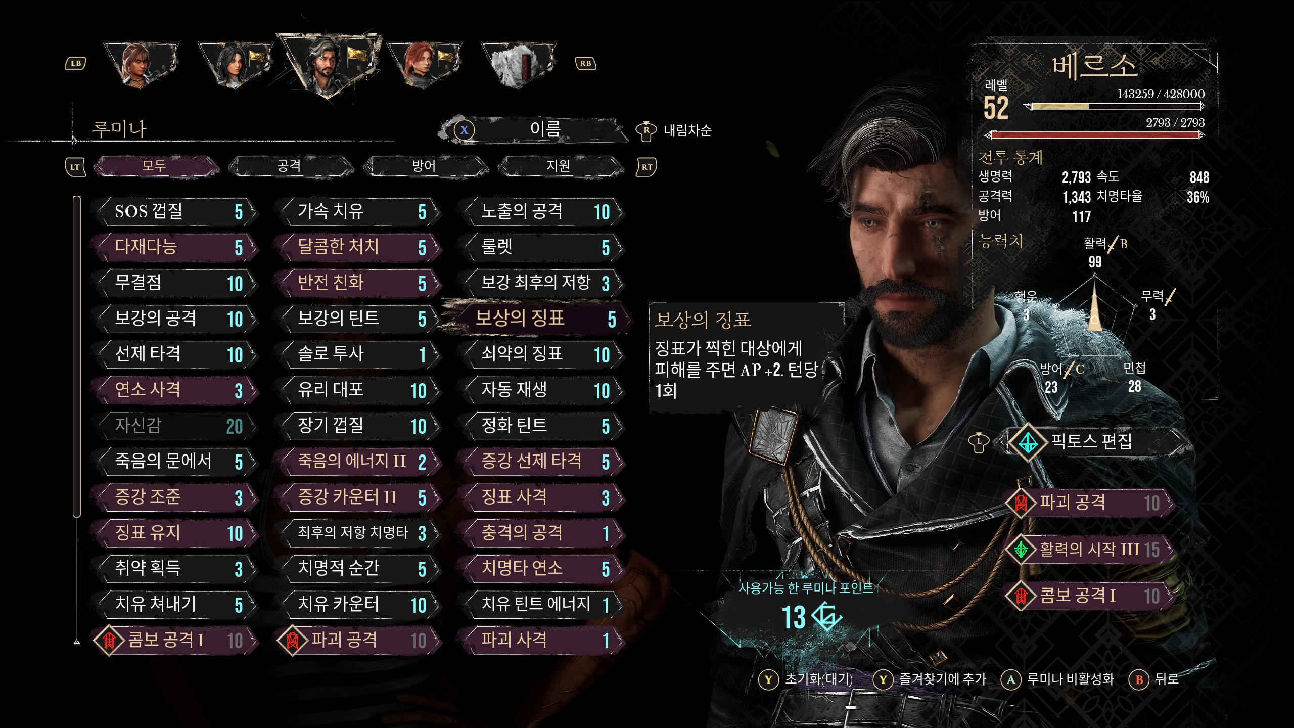 픽토스 : 다재다능, 증강조준, 파괴사격, 보상의 징표 등. 기본적으로 사격 관련 픽토스와 ap를 늘려주는 픽토스 위주로 세팅하면 됩니다.