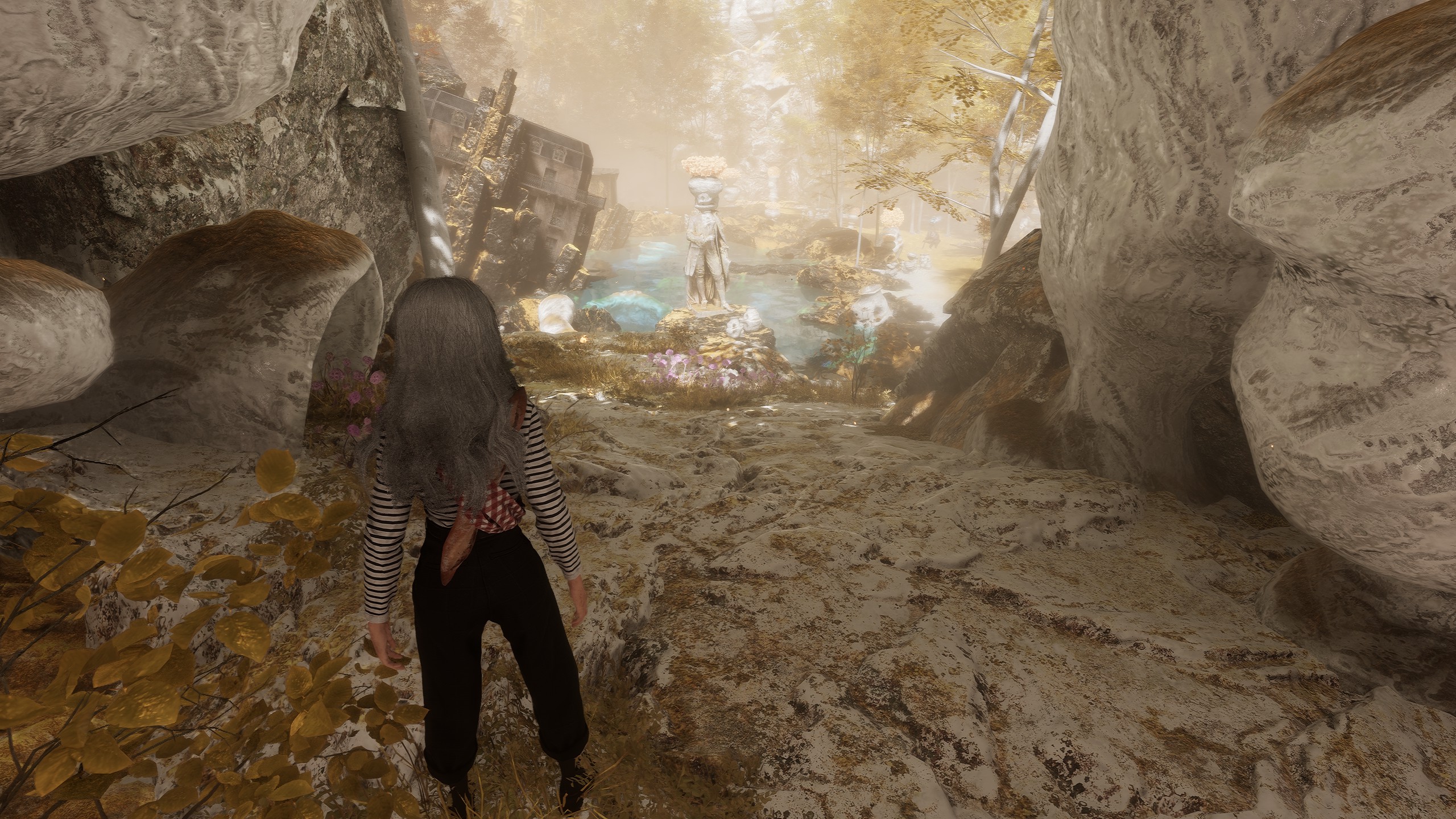 이후 카메라를 돌려서, 무너진 건물과 호수가 있는 공간으로 내려갑니다.