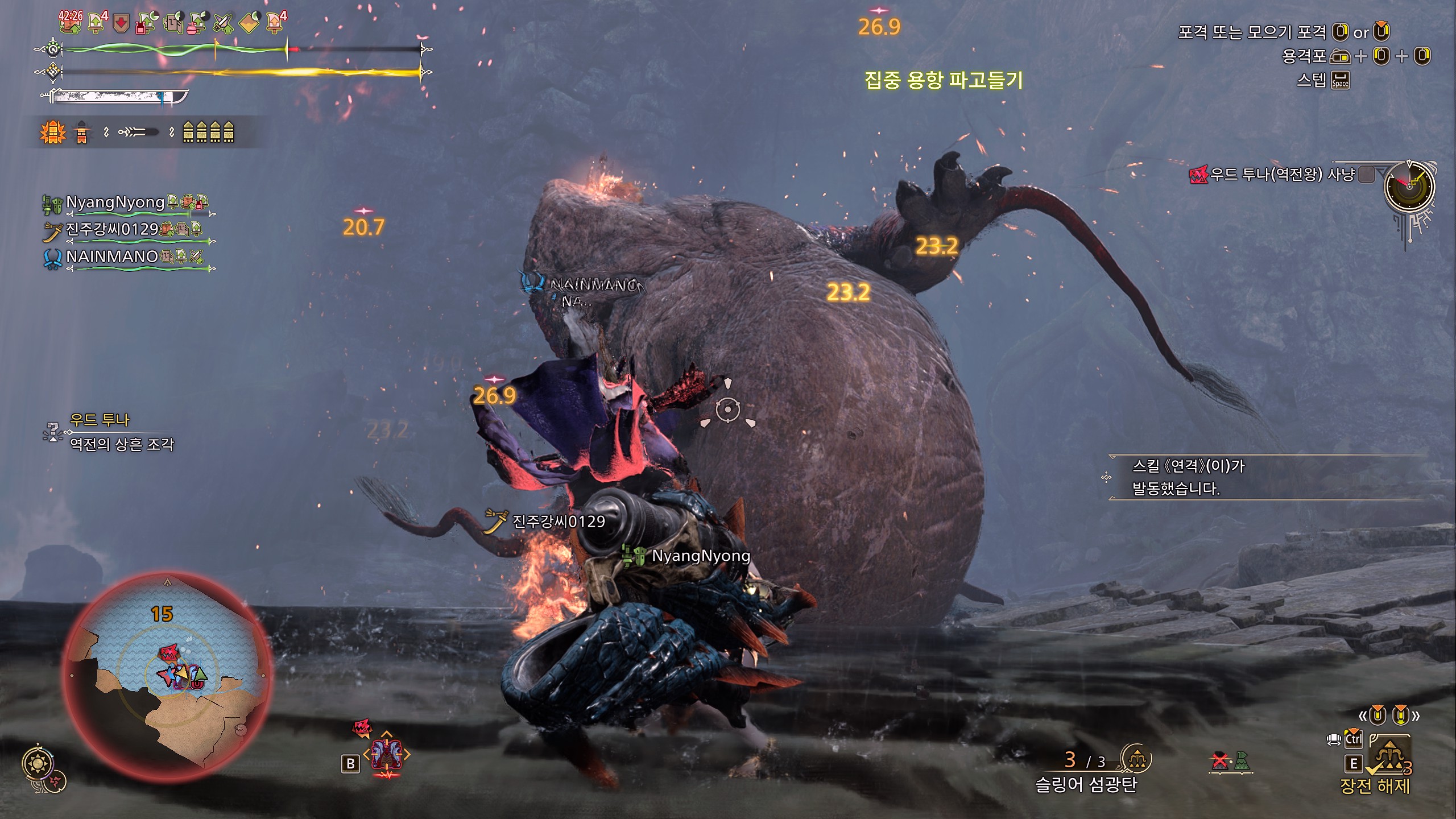 손검 같은 무기는 타겟이 아니더라도 납도하고 뛰어가서 집약공을 넣을 수 있는 경우도 있지만, 다른 검사무기들은 파도나 거리상의 문제로 잘 안됩니다