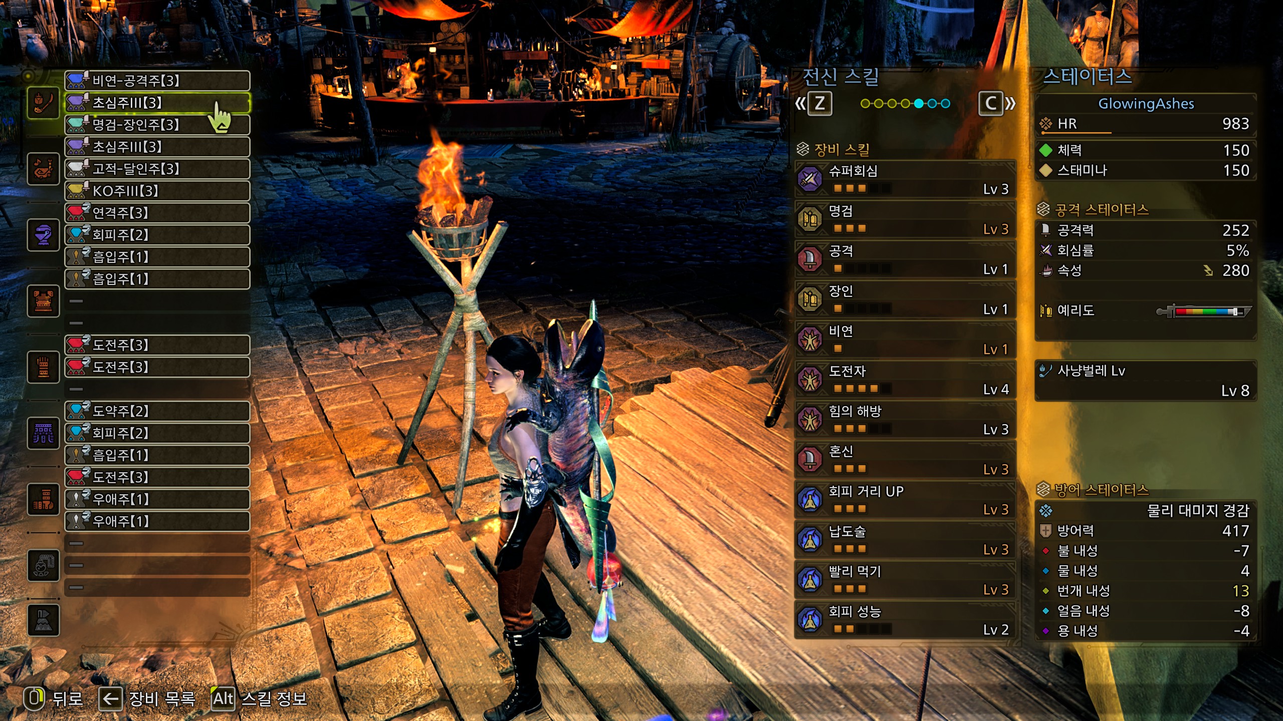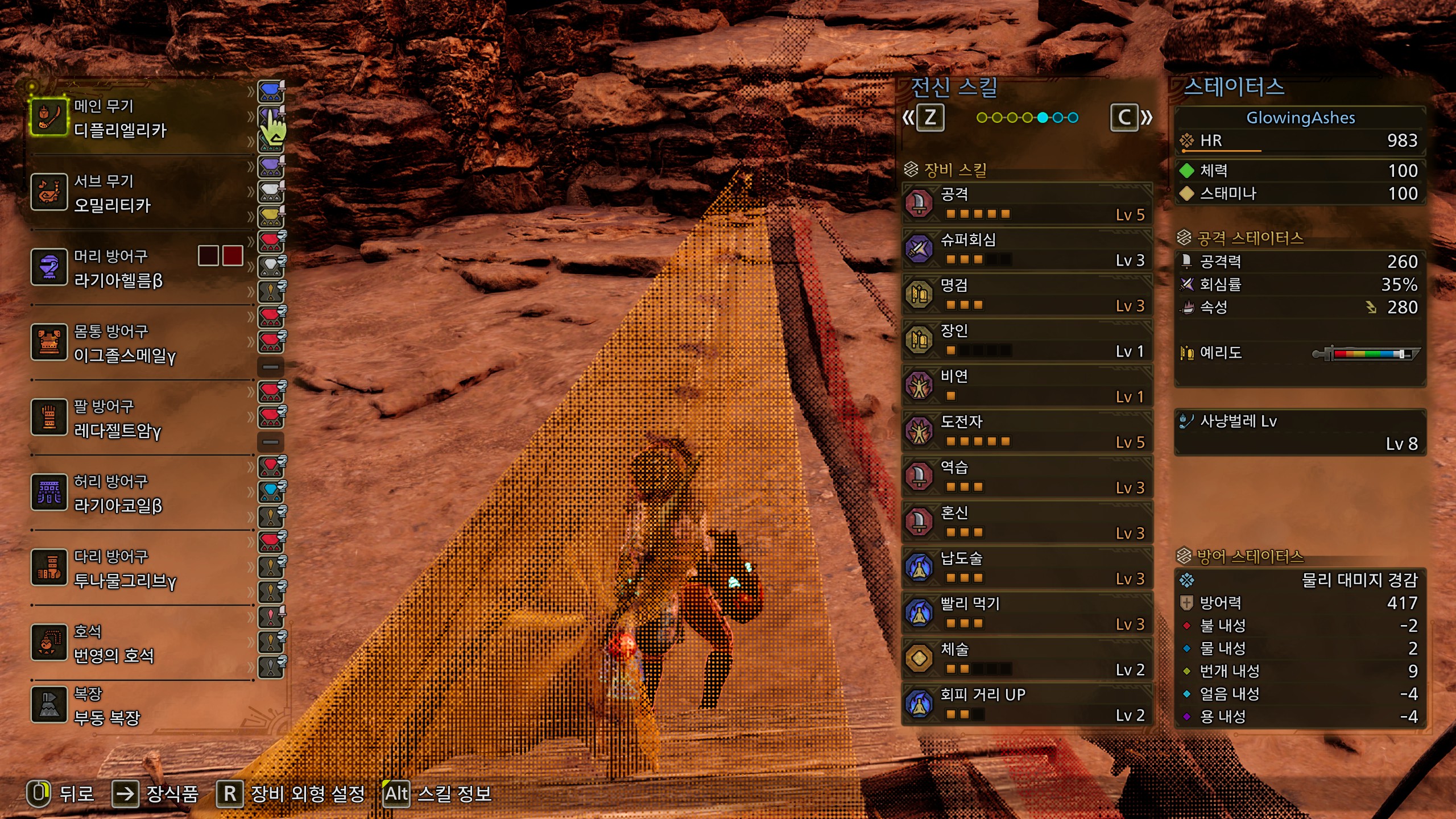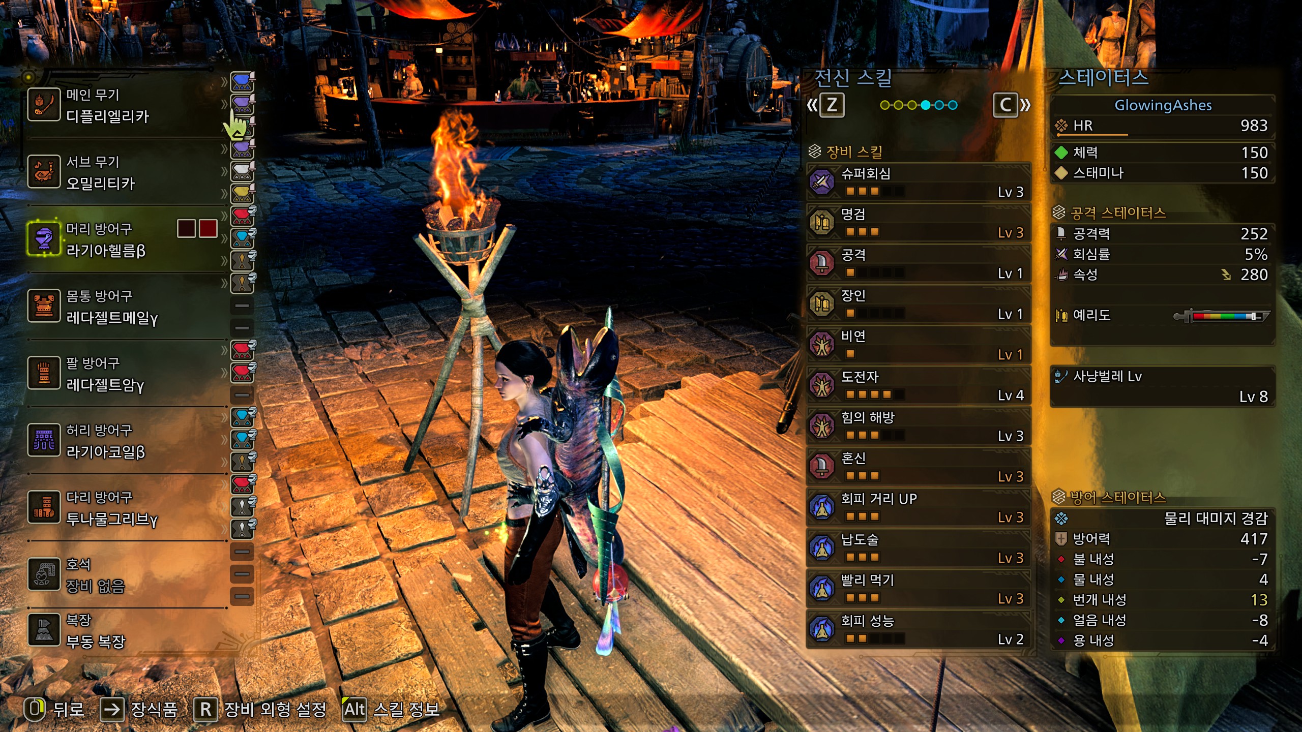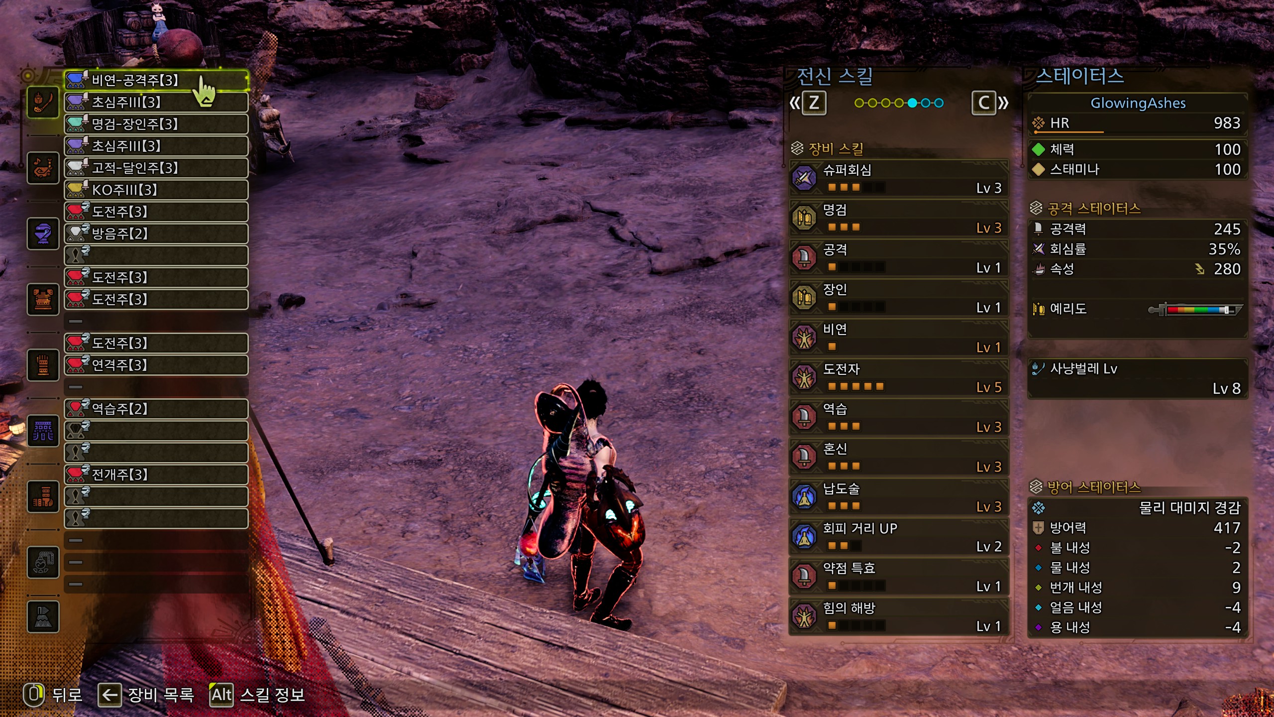 스샷에는 회거3, 빨먹3, 회성2 등을 챙겼는데, 몬스터에 따라서 귀마개1, 회거를 적당히 조절하세요