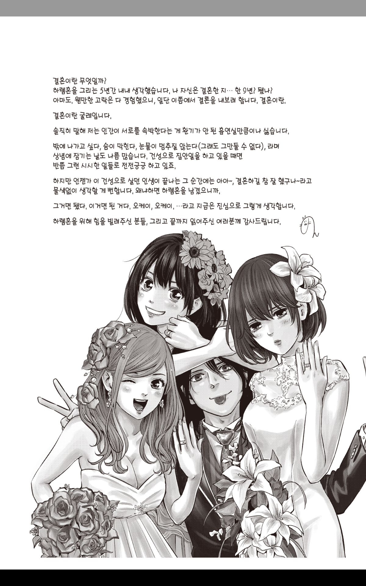 하렘혼도 여캐 작화는 좋지만, 스토리(남편이 스작)는 작화에 비해 아쉬운 감이 없잖아 있다. 정확히는 갈등이 빚어지는 부분은 그럴싸한 편이지만, 갈등이 해소되는 과정이나 결말이 구렁이 담 넘어가듯이 부드럽다보니 다 읽고 난 후에는 '이 년들이 뭐 때문에 싸웠더라? 기억은 안나지만 대충 다 행복해졌으니 어찌됐든 상관없나' 같은 기분이 된다는게 문제다.