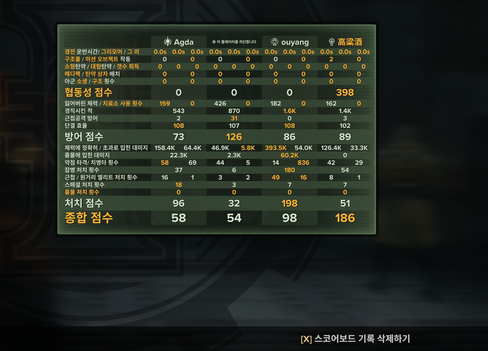 ...뒤에서 오는 호드+엘리트 스페셜 웨이브를 3명이서 막고 있는데, 혼자서 20미터 이상 앞질러간 뒤 게임을 터트리는 트루렙 2000+의 한국산 오그린도 봤고(플레이가 폐급인데 불평 불만은 많아서 스코어 보드를 까보니 흉물 딜을 많이 넣은 것도 아니고, 토탈 딜을 많이 넣은 것도 아니고, 엘리트 스페셜을 많이 잡은 것도 아니고, 경직을 많이 넣은 것도 아니고, 잃은 체력이 적은 것도 아니고 도대체 뭐하는 인간인지 궁금할 정도)