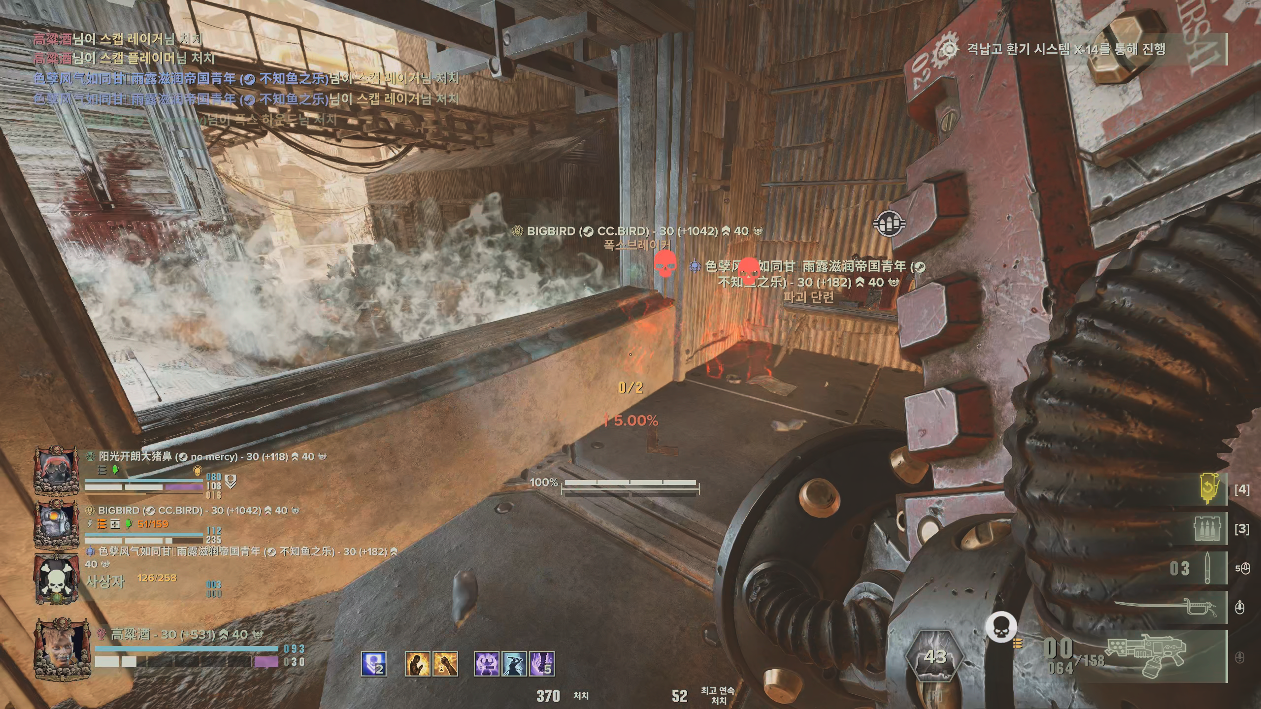 바깥의 보머를 정리 했으니, 힐스테이션쪽 불장판이 사라지면 빠르게 모두 전진해서 연막, 돔을 끼고 바깥의 물량을 정리해야 한다