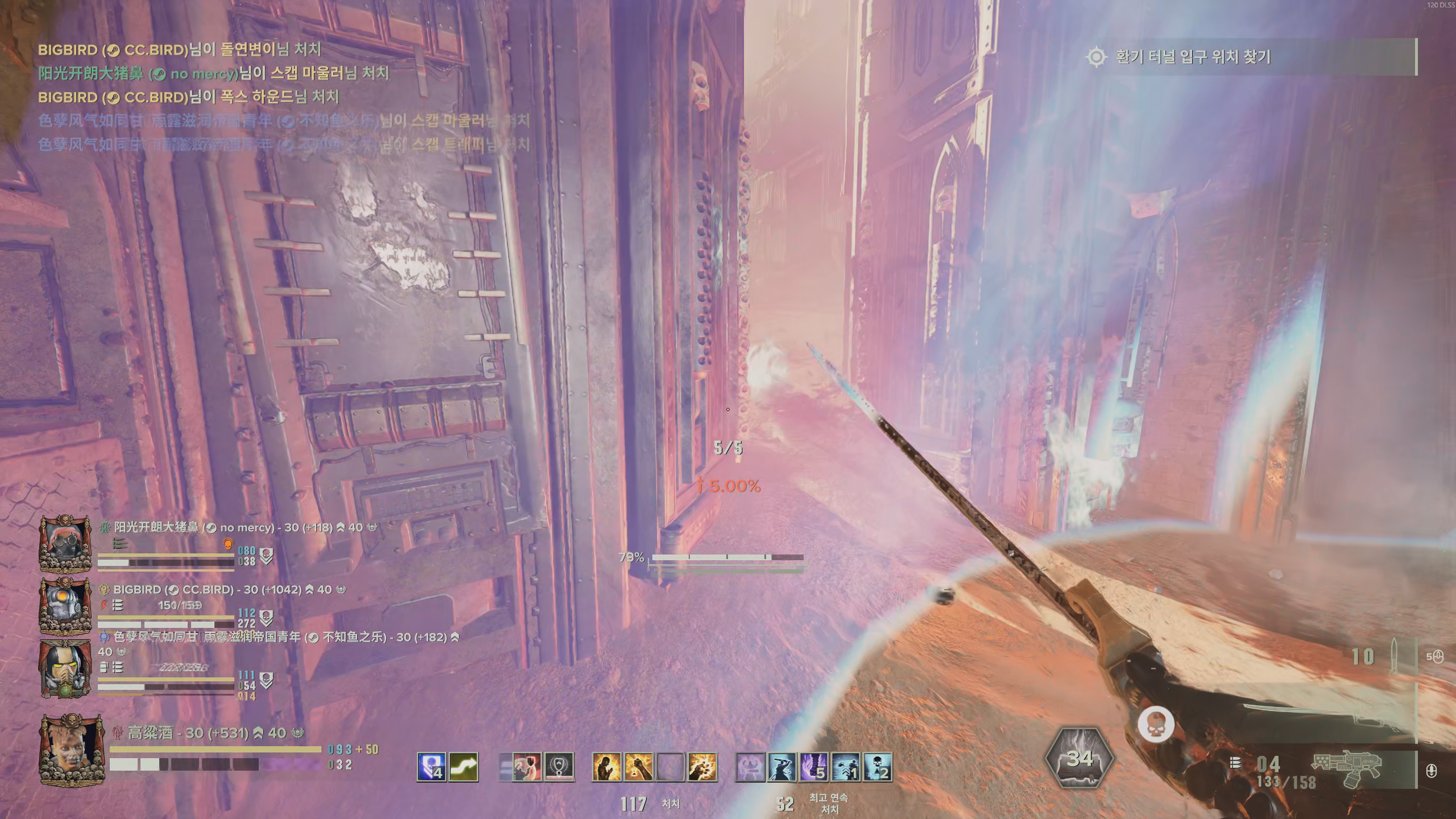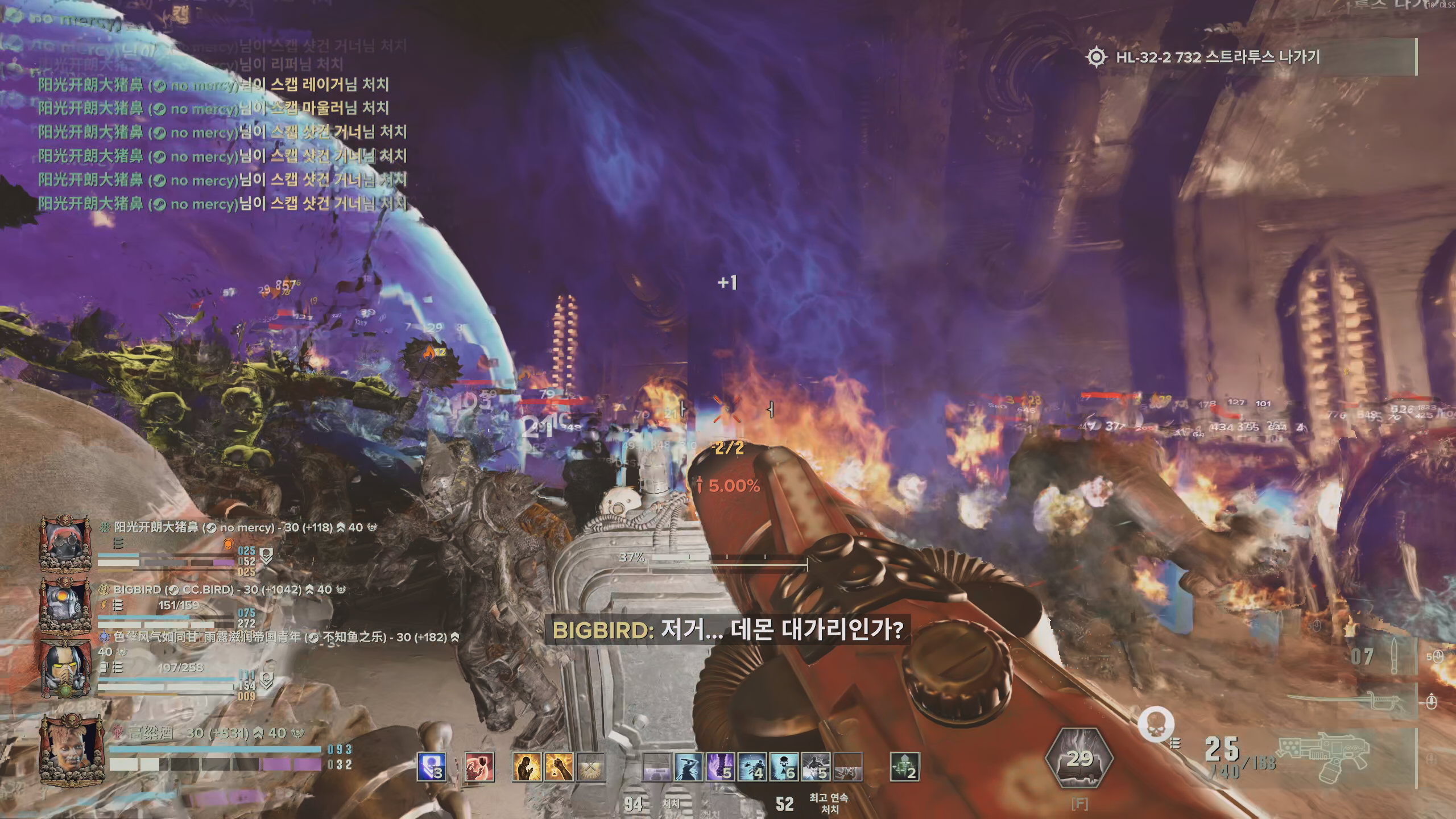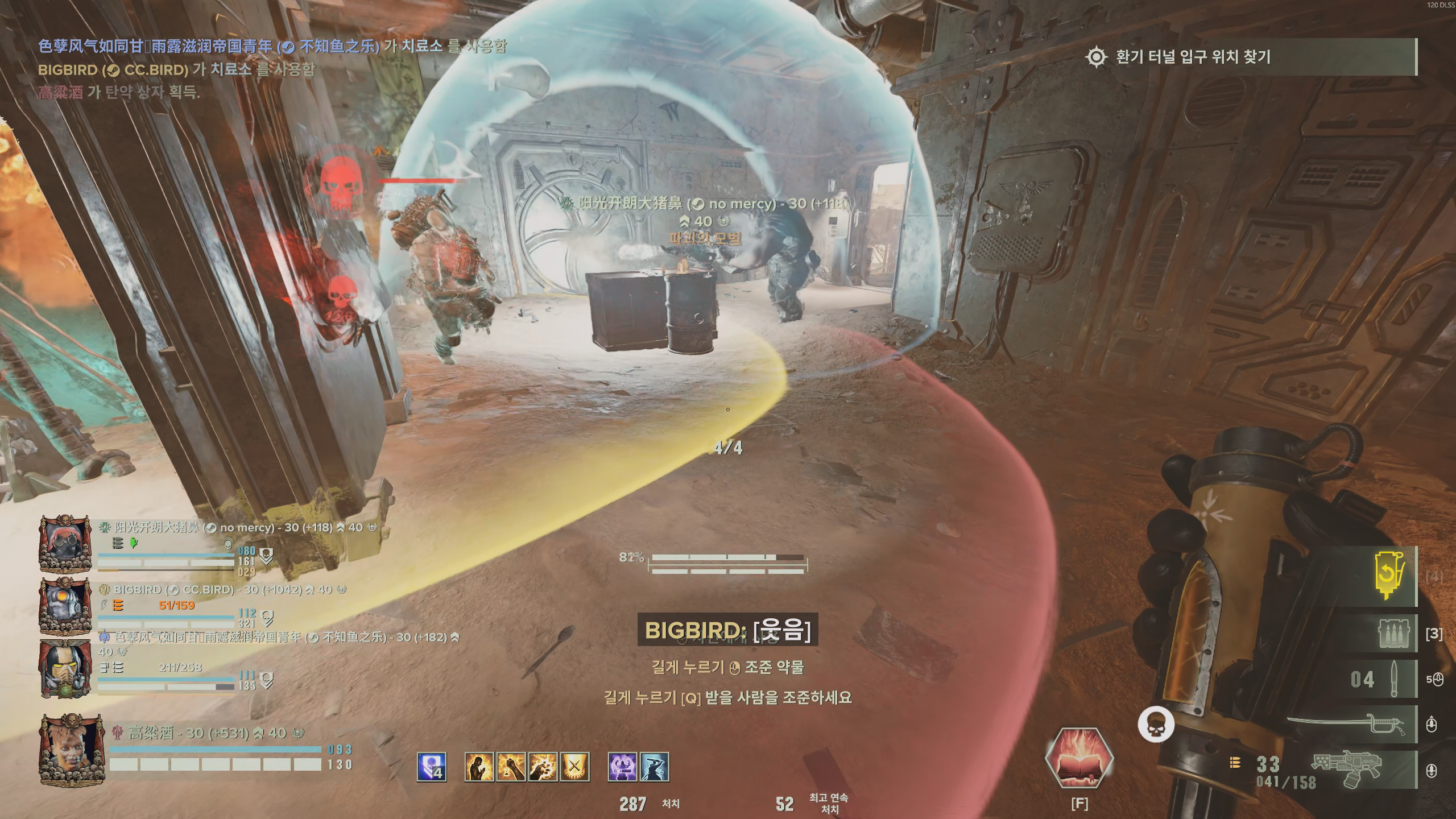 이후 카오스 스폰을 처리했지만, 어째선지 돔 안에 불장판이 깔렸고, 문 안쪽에서는 지형 때문에 베테랑이 문 바깥의 보머들을 잡기 어렵기 때문에 밖으로 나가서 보머를 따고 합류하기로 했다
