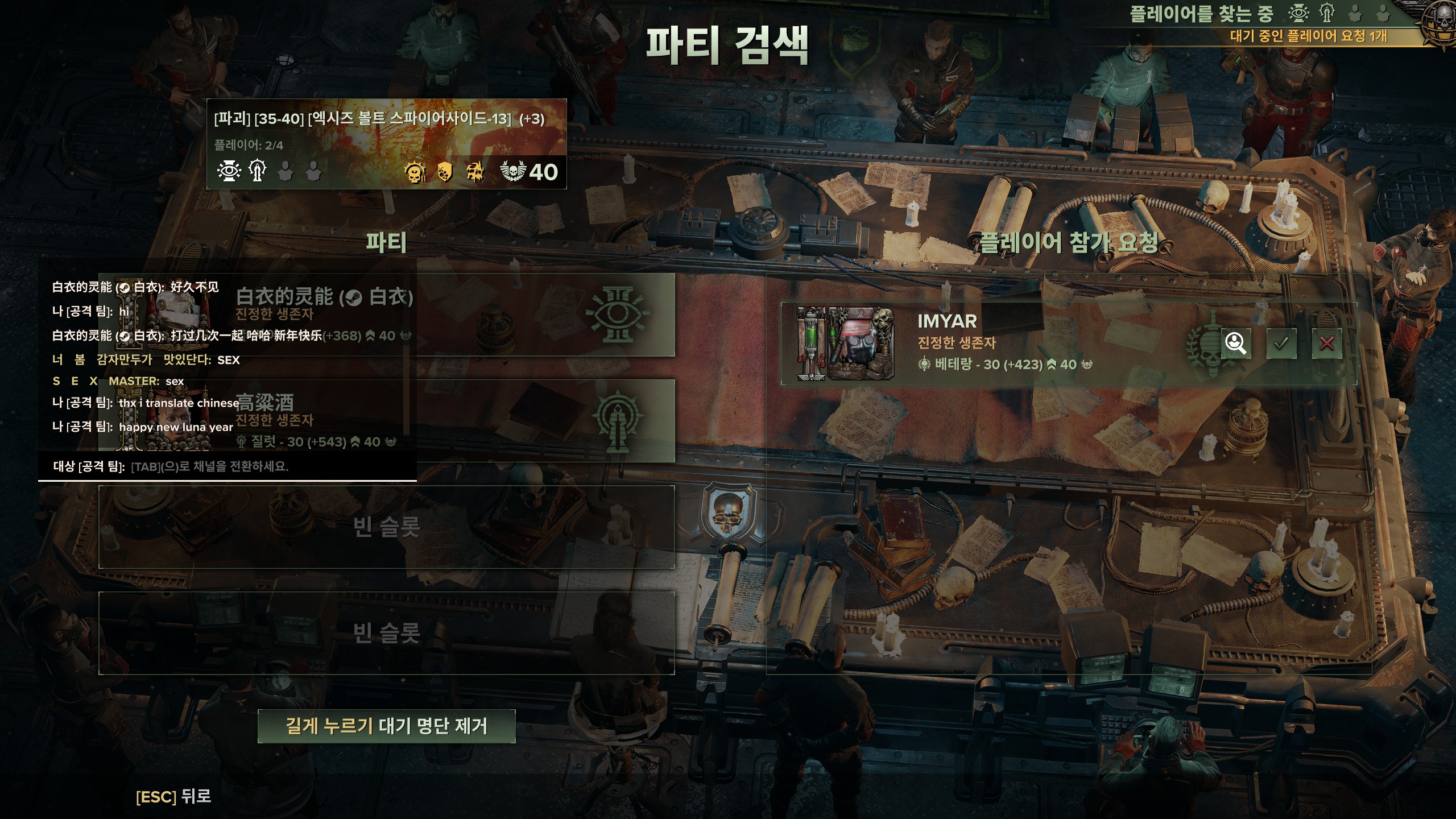 하복 40단을 돌리면서 국적 불문 개같이 못해서 다시는 게임을 같이 하고 싶지 않은 사람들만 메모장에 적고 있는데, 요즘 들어 인사를 하는 중국인들을 종종 만나서 다른 종류(?)의 메모장을 만들어야 하나 고민이 된다. 중국인들 대부분 닉이 길기도 하고, 모르는 한자가 많다보니 닉을 기억하는 것도 쉽지 않고, 직관적으로 연상이 되지 않기 때문이다.