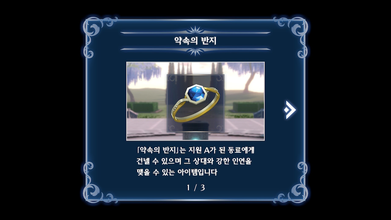 이 외전을 클리어하면 약속의 반지를 획득하게 되고, 지원도 A랭크를 찍은 동료에 한해 반지를 건네줄 수 있게 됩니다.