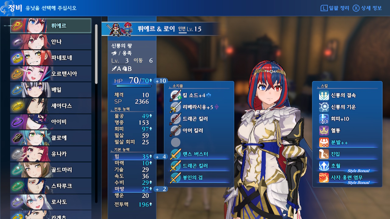 19. 에델가르트 팔찌(dlc)에 인게이지 한 후, 벨레트 문장사(벨레트 문장사는 인게이지 상태가 아니더라도 ok) 바로 옆에 유닛을 위치시키면 연화월풍섬+가 활성화 된다.
