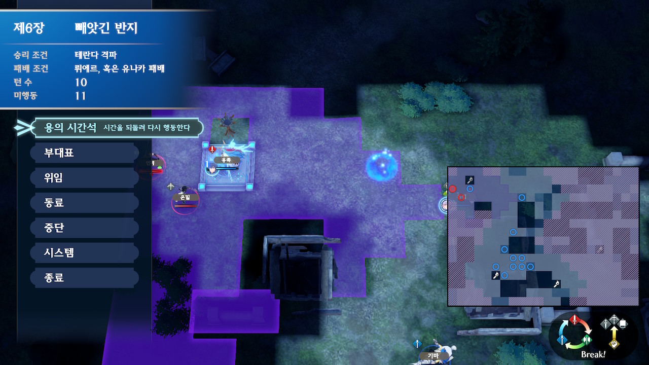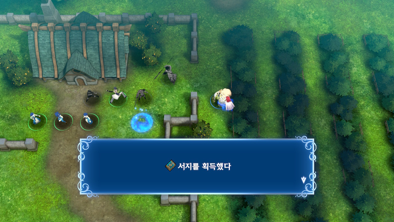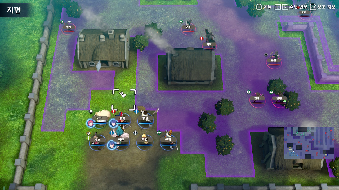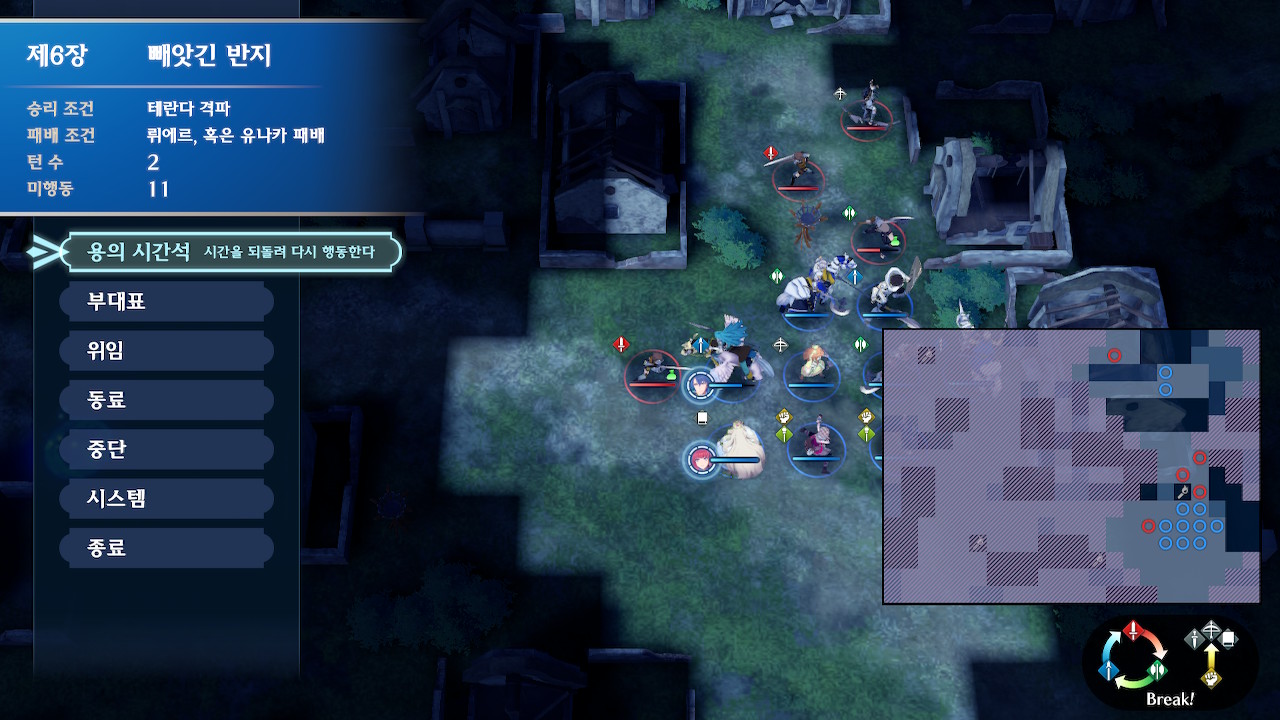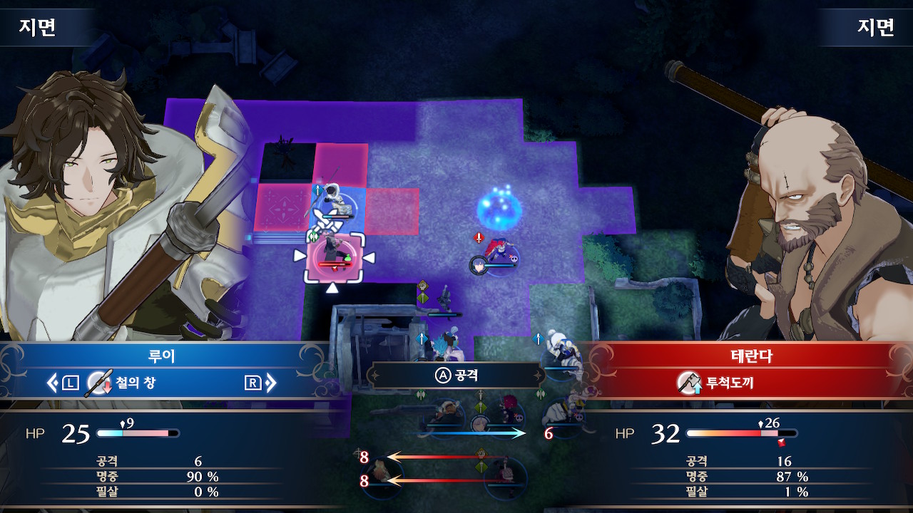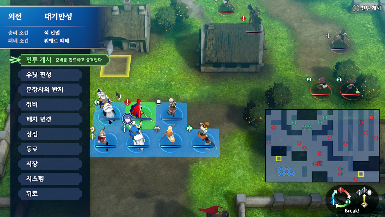 뤼에르는 본대와 분리되어 있고, 아군 본대는 조금 아래쪽에 위치해 있습니다. 본대 위쪽에는 아이템을 드랍하는 적군이 한기 보여서, 전투 개시를 누르자마자 위로 달려가기 쉬운데, 주변에 적군이 숨어 있습니다.
