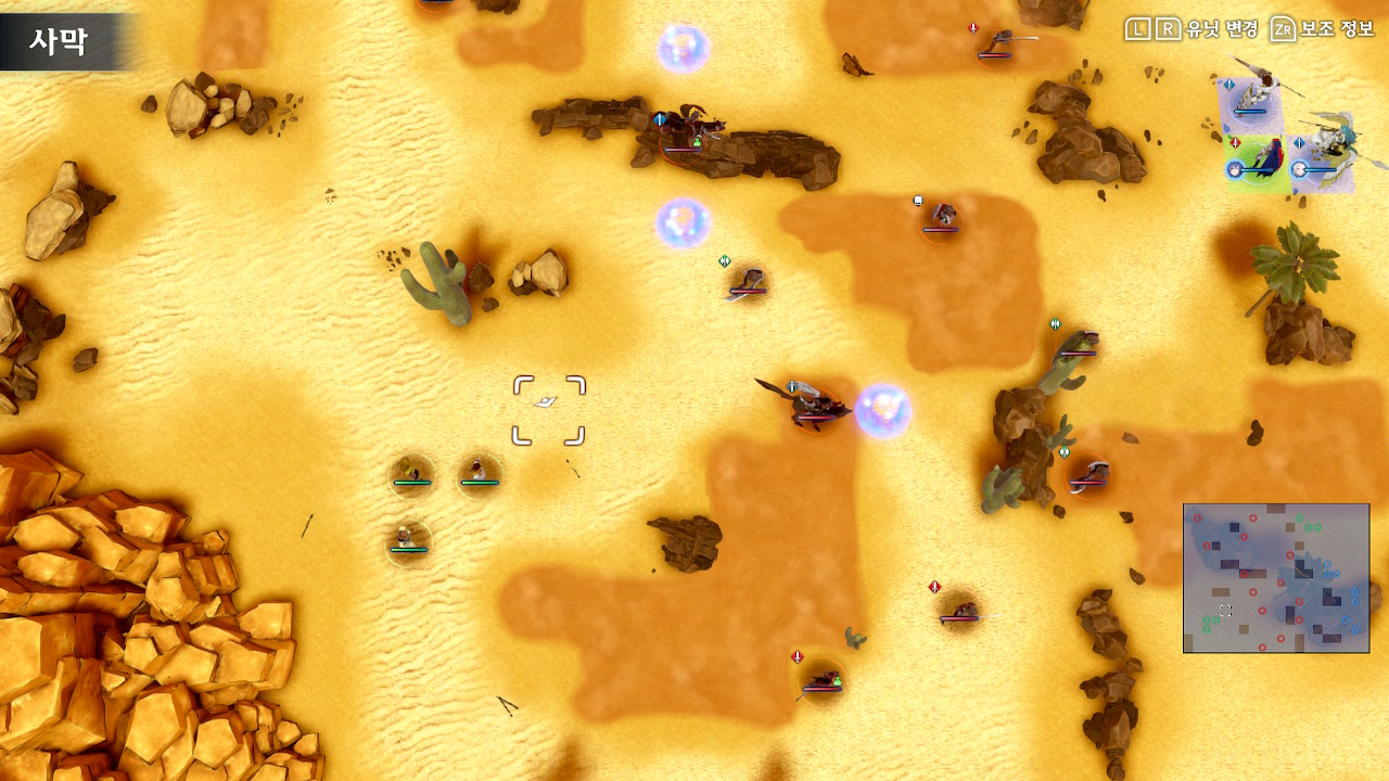 이번 전투는 7시 방향에 있는 3명의 민간인을 보호하는게 중요합니다. 필드 곳곳에 펼쳐져 있는 모래 구덩이에서는 이속이 느려지기 때문에 구덩이를 넘어갈 때는 이속이 느린 아군을 먼저 이동시키고(반대편에 적군이 있다면 이속이 느린 유닛보다 탱커를 먼저 이동) 그다음에, 이속이 빠른 유닛을 보내야 정체현상이 덜합니다.