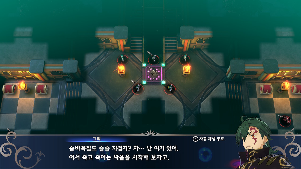 이번 전투에서는 그리가 좌 혹은 우 구석탱이에 숨어 있습니다. 초장에 그리의 라이프 스톡을 1개 빼지 않으면, 계속 워프라이나를 쓰면서 플레이어를 괴롭히기 때문에 1턴에 그리의 위치를 파악하는게 먼저입니다.