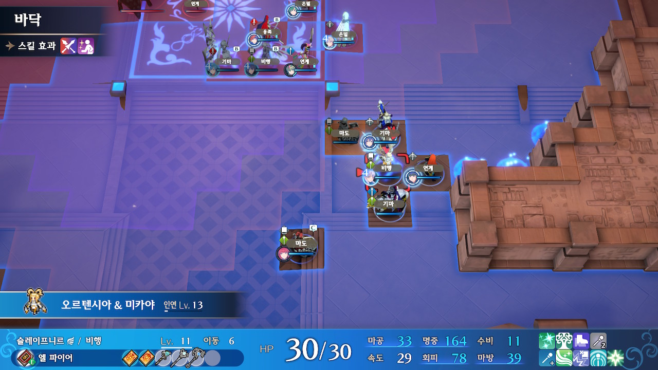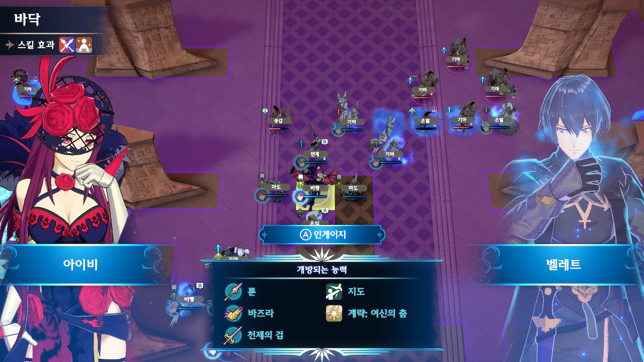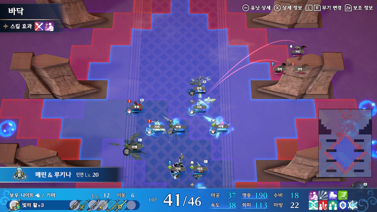 좌하단의 이형룡을 잡은 직후, 위쪽의 보우나이트의 공격범위에 노출될 수 있습니다. 그런 경우에는 미카야 인게이지+아이스록으로 별동대를 보호 해주세요.