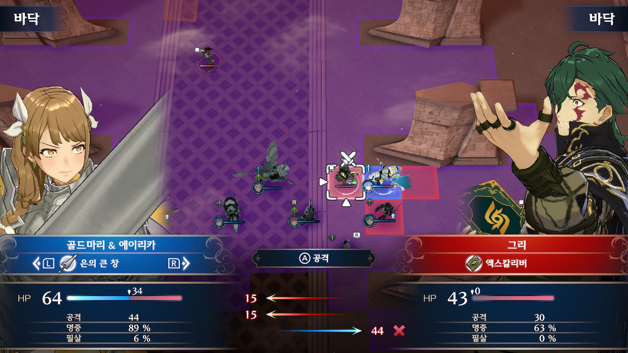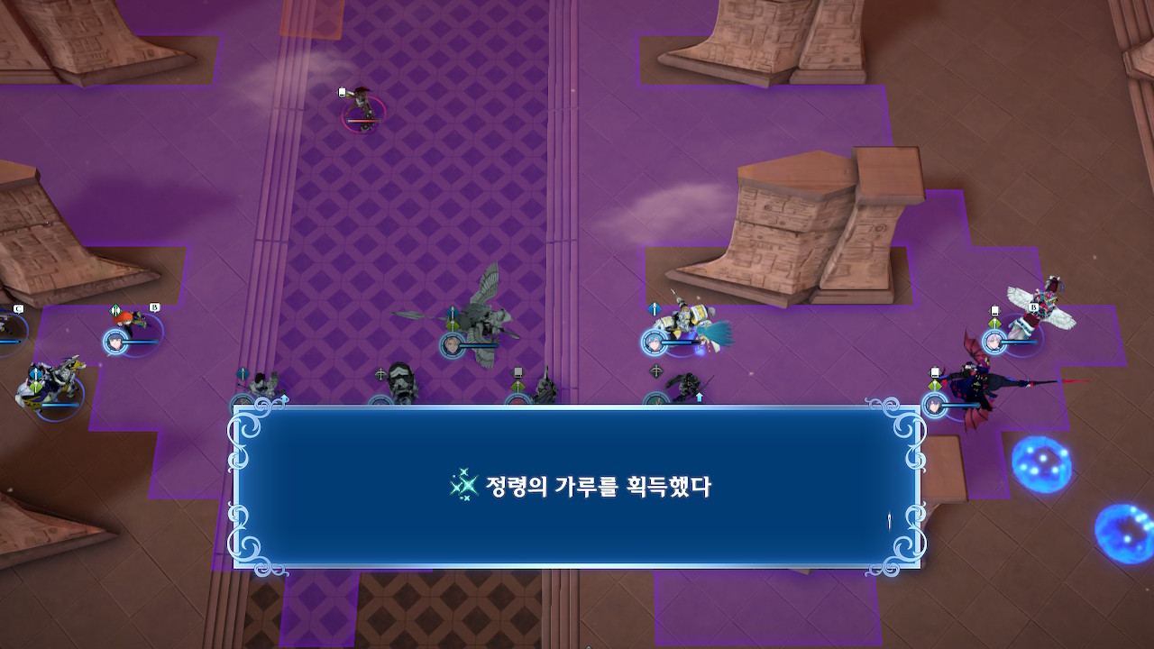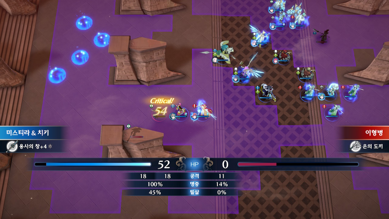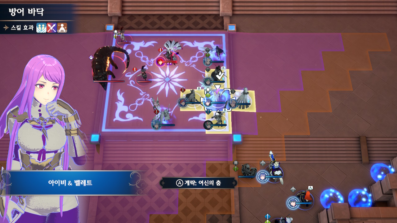 그러니 되도록이면 선빵을 치지 말고, 스쿼드의 기동성을 잘 고려해서 진형을 잡은 후(위 스샷에서 뤼에르, 미스티라가 위치한 보라색 범위까지는 괜찮습니다. 지팡이 범위 내에 들어가지만 않으면 ok) 한꺼번에 들어가야 합니다.