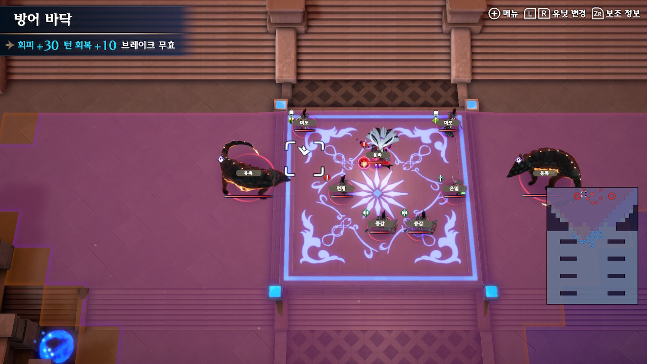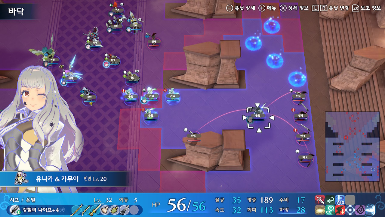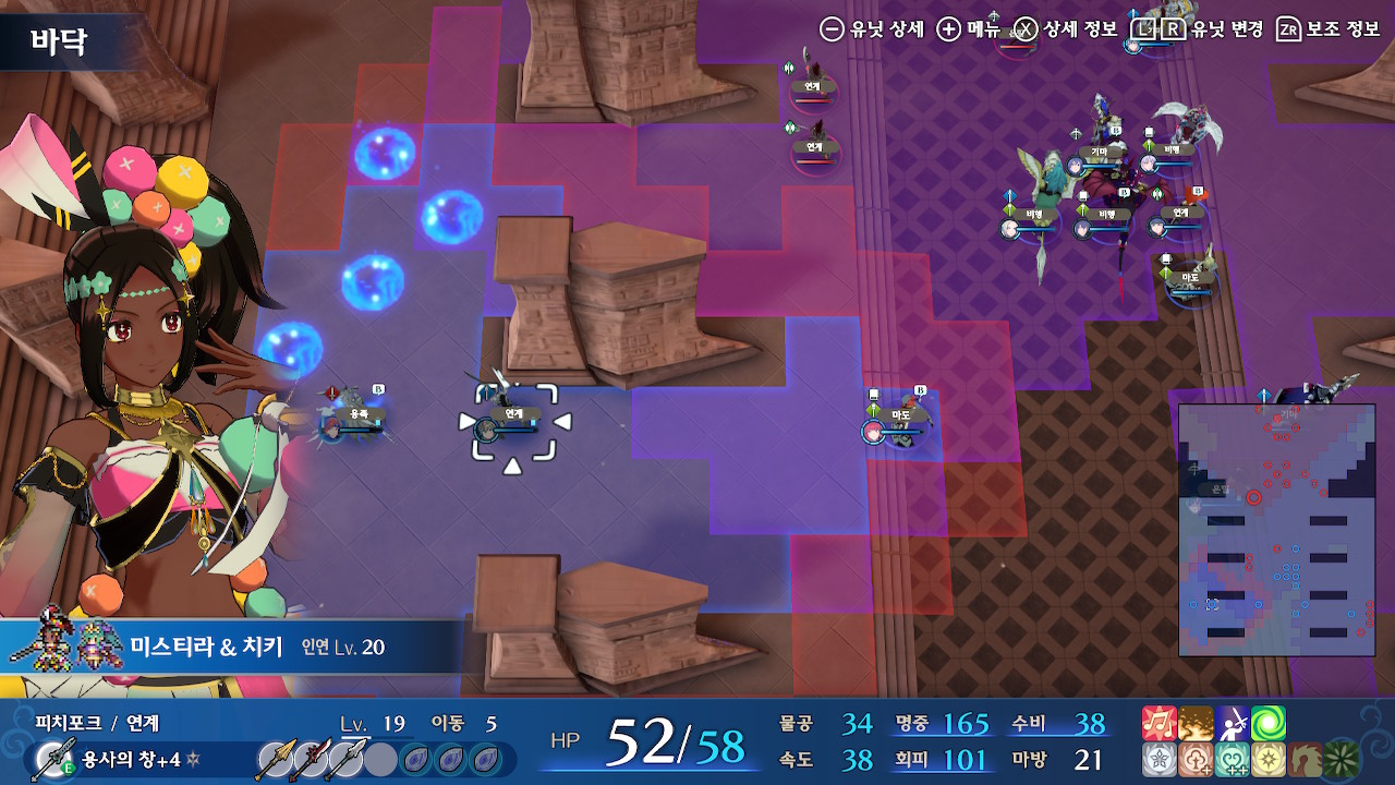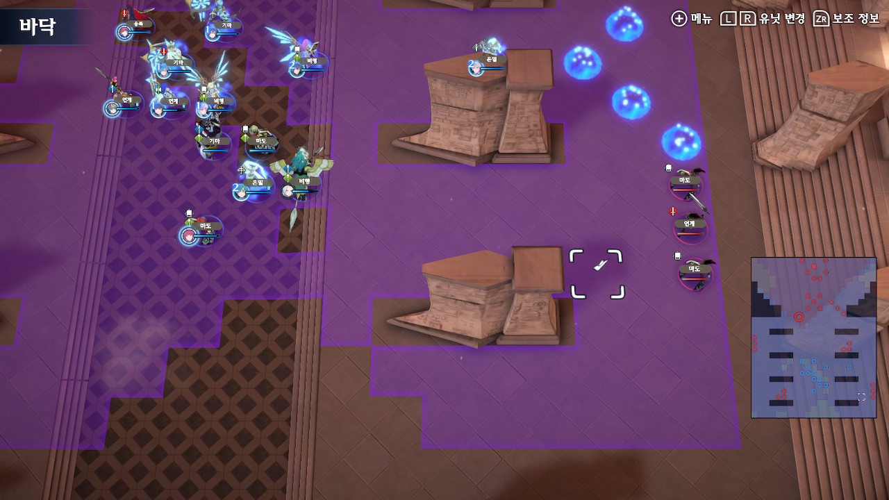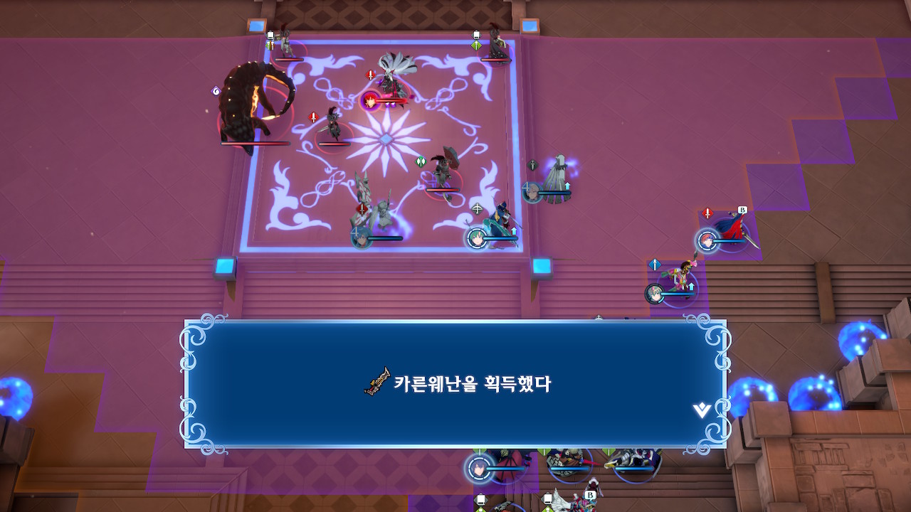 그러니 되도록이면 선빵을 치지 말고, 스쿼드의 기동성을 잘 고려해서 진형을 잡은 후(위 스샷에서 뤼에르, 미스티라가 위치한 보라색 범위까지는 괜찮습니다. 지팡이 범위 내에 들어가지만 않으면 ok) 한꺼번에 들어가야 합니다.