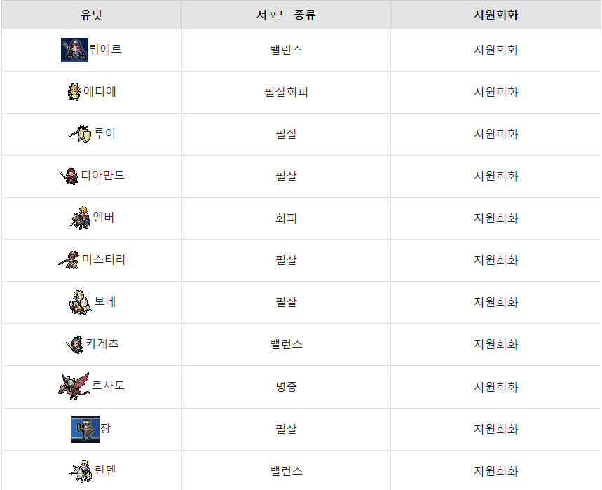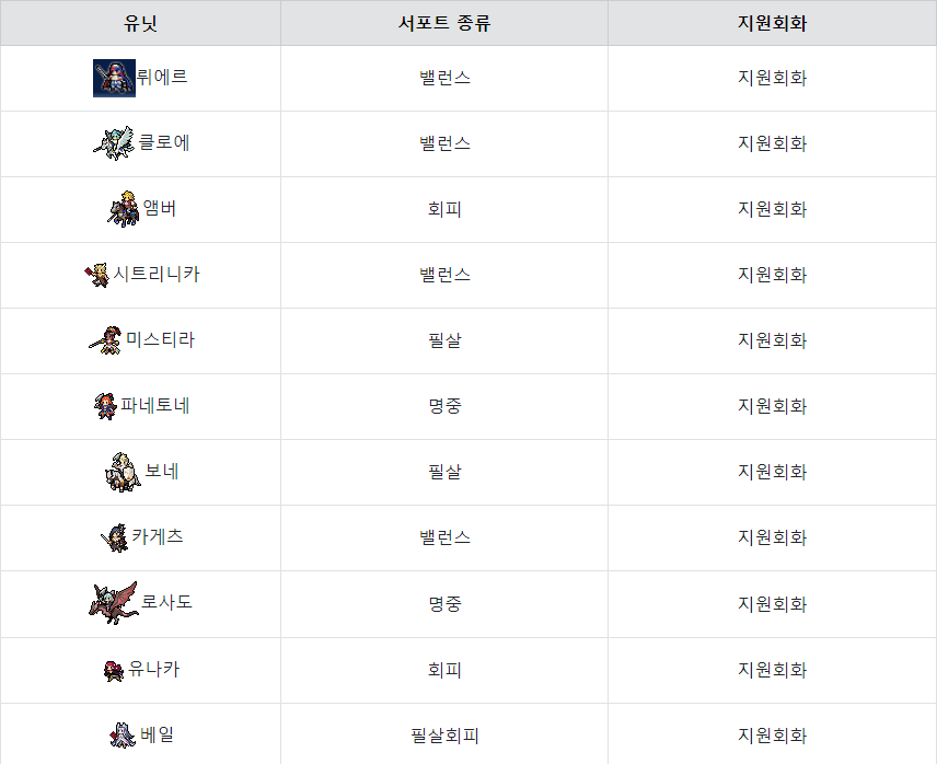지원회화 목록을 훑어보면...일반적으로 출격랭킹이 높을 것 같으면서, 기본 성능이 좋은 유닛은 뤼에르와 카게츠 뿐(...). 그래서 아무 생각없이 출격시켰을 때 지원이 뜨는 유닛이 1기만 있는 경우가 발생할 수 있습니다.