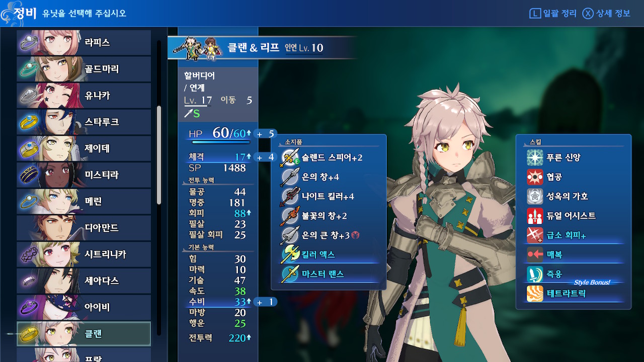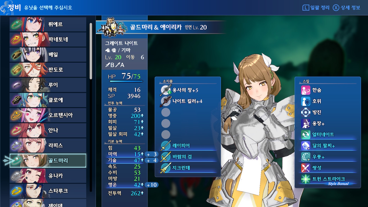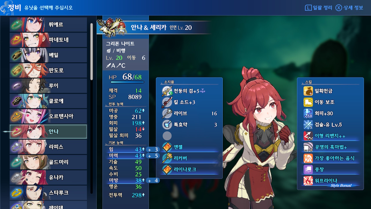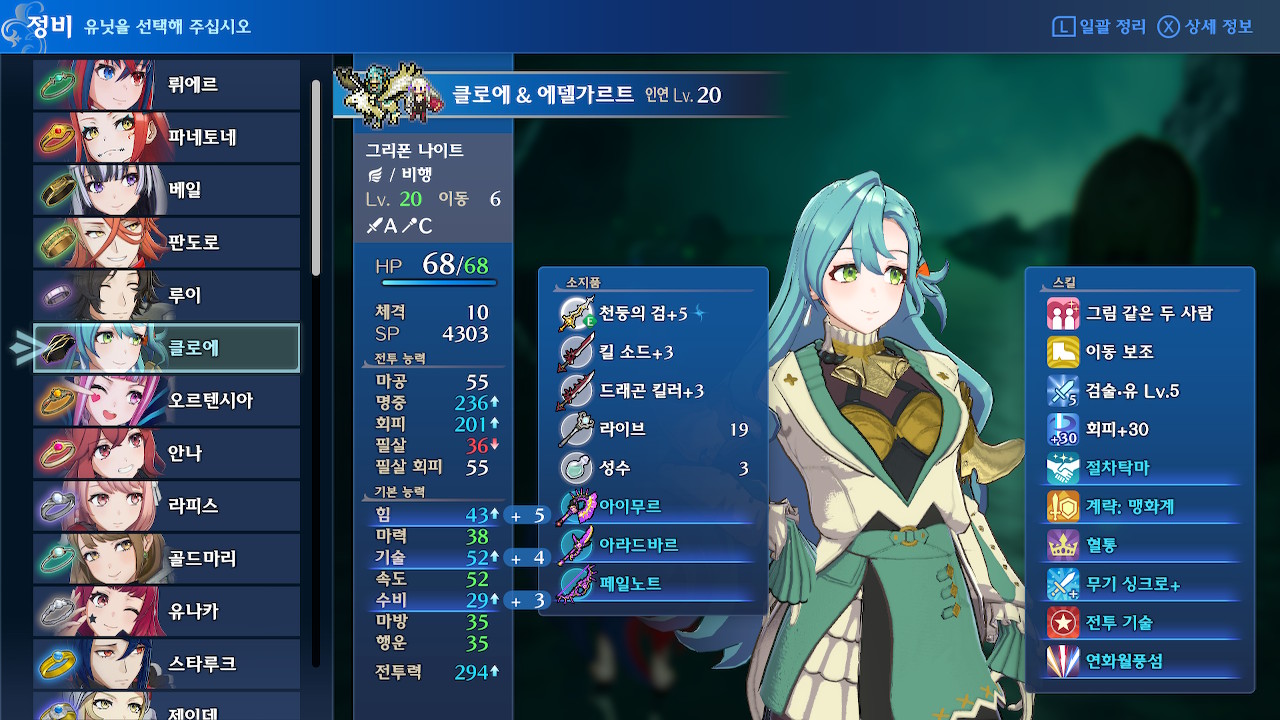 사실 엔딩 이후 연전용 그리폰 나이트는 어쩔 수 없이 검술 유 회피 30을 달아야 하고, 인게이지도 큰 의미가 없습니다. 그나마 삼반장은 페일노트, 필살기가 좋아서 차별화가 되지만..