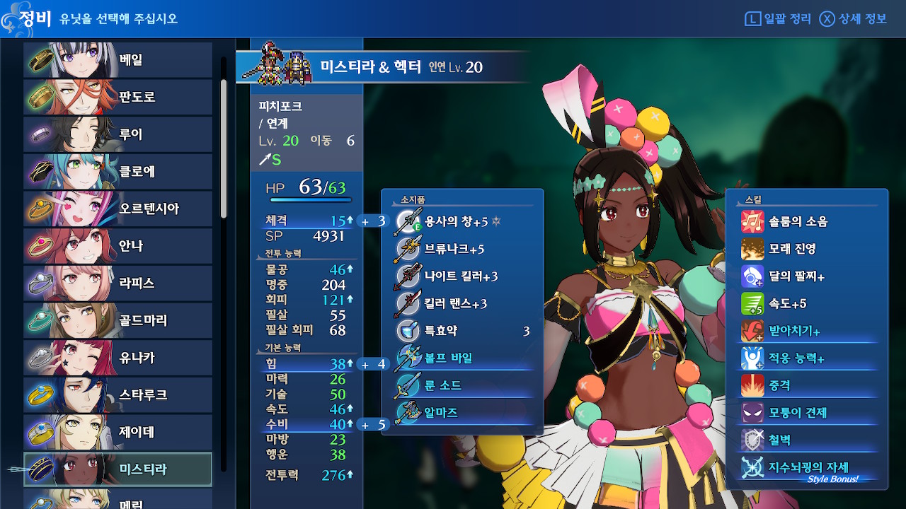 엔딩 이후에는 말했다시피 고속 유닛들도 있고, 조우전, 연전 모두 안키운 유닛을 키울 때를 제외하고 5턴 이상 가는 경우가 없어서 속흡의 효율이 급감합니다. 기술-수비 같은 스킬이 있으면 무지성으로 달아줬을텐데, 미스티라에게 어울리는 문장사는 있어도 스킬은 딱 좋다 싶은게 없습니다.