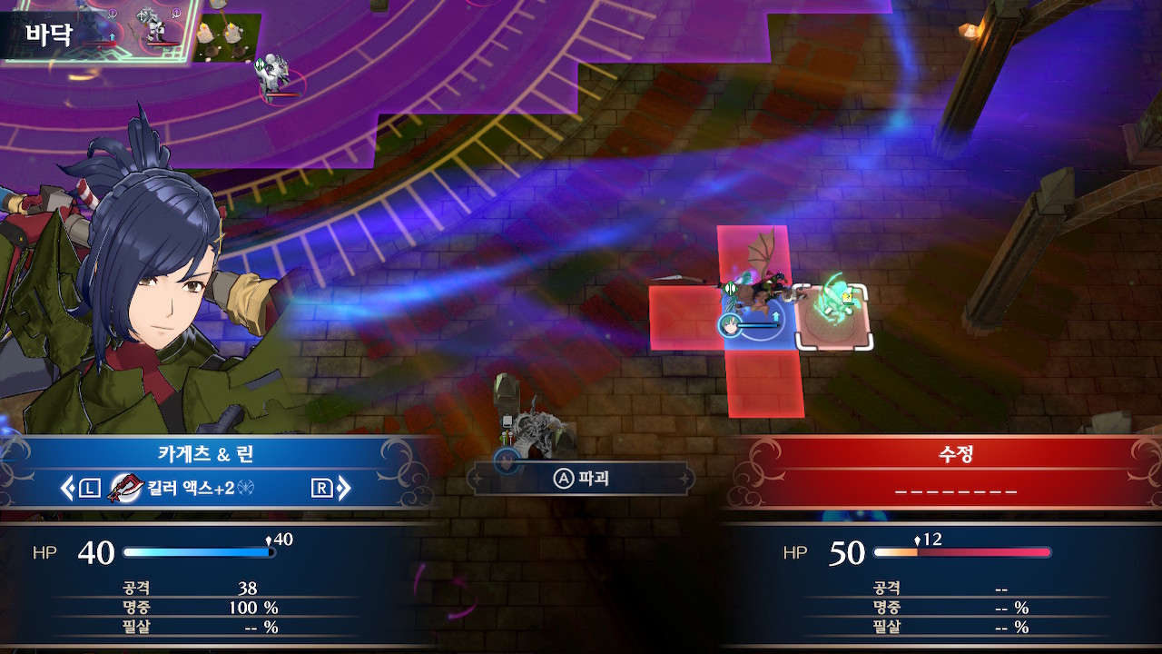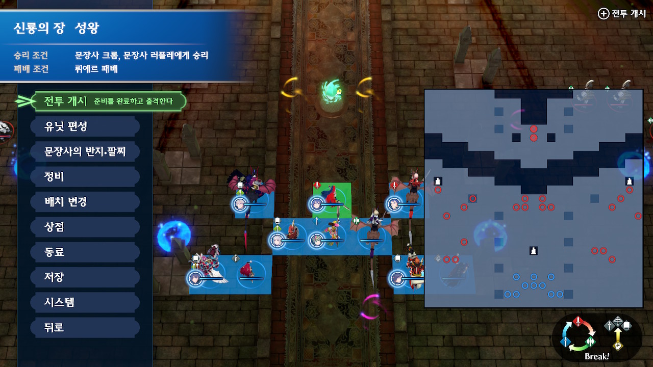 전투 개시를 눌러보면 아군 주변에 적군이 다수 포진해 있는데, 필드에 문장의 기운도 많으니 인게이지를 팍팍 써서 적군을 정리합시다.