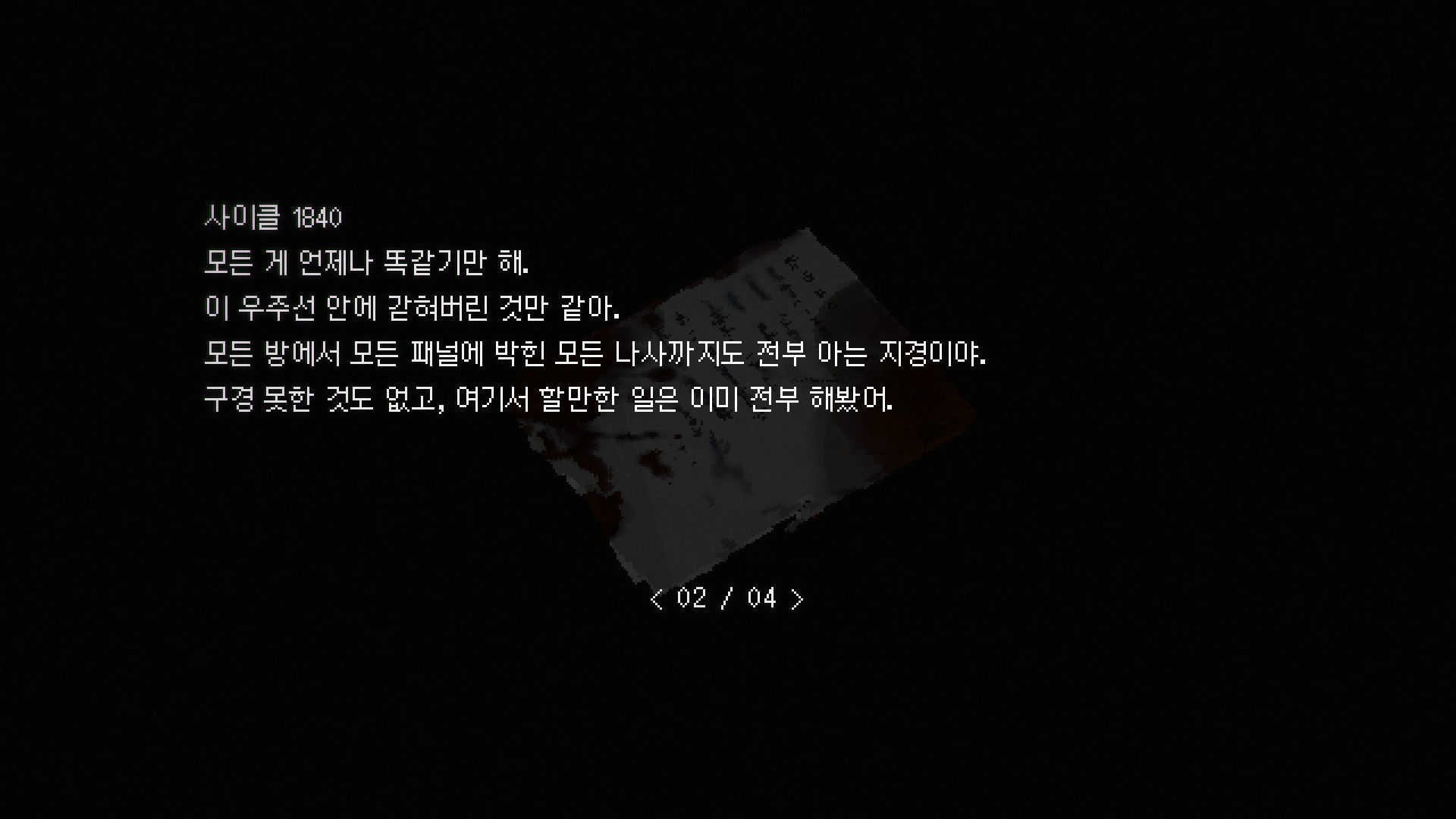 잘 와닿지 않을 수도 있을 것 같아 정리하자면, 시그널리스의 퍼즐들은 필드의 오브젝트와 아이템에 숨겨진 단서를 조사-취합하고, 해답을 도출 하는 보물찾기 놀이로 받아들이면 될 것 같다. 그 과정을 일련의 폐지줍기로 느끼는 사람이라면 대단히 지루하게 느낄 소지가 있지만, 청각과 시각을 자극·활용하는 장치들 덕택에 나는 끝까지 흥미롭게 즐길 수 있었다.