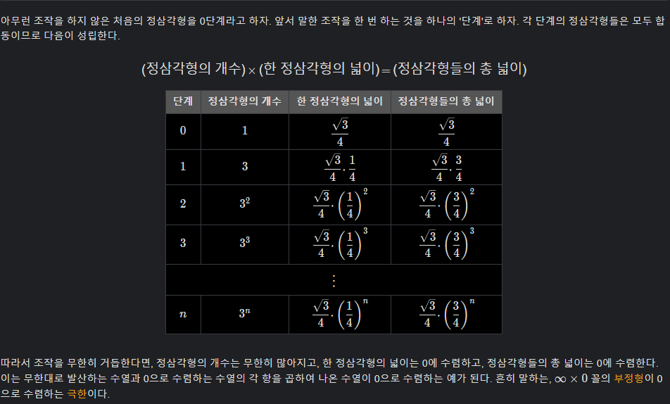 시에르핀스키 삼각형, 펜로즈의 삼각형... 앞서 말했듯이 펜로즈의 삼각형은 실체가 없는 허상이며, 시에르핀스키 삼각형은 무한히 반복 확장되지만 그 면적은 결국 0, 아무 것도 아닌 0이다.