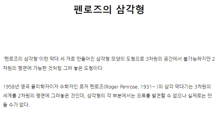 펜로즈 삼각형은 시각적으로는 삼각형처럼 보이지만 실제로는 삼각형이 아니다. 관념상으로만 존재하는 도형인 것이다.