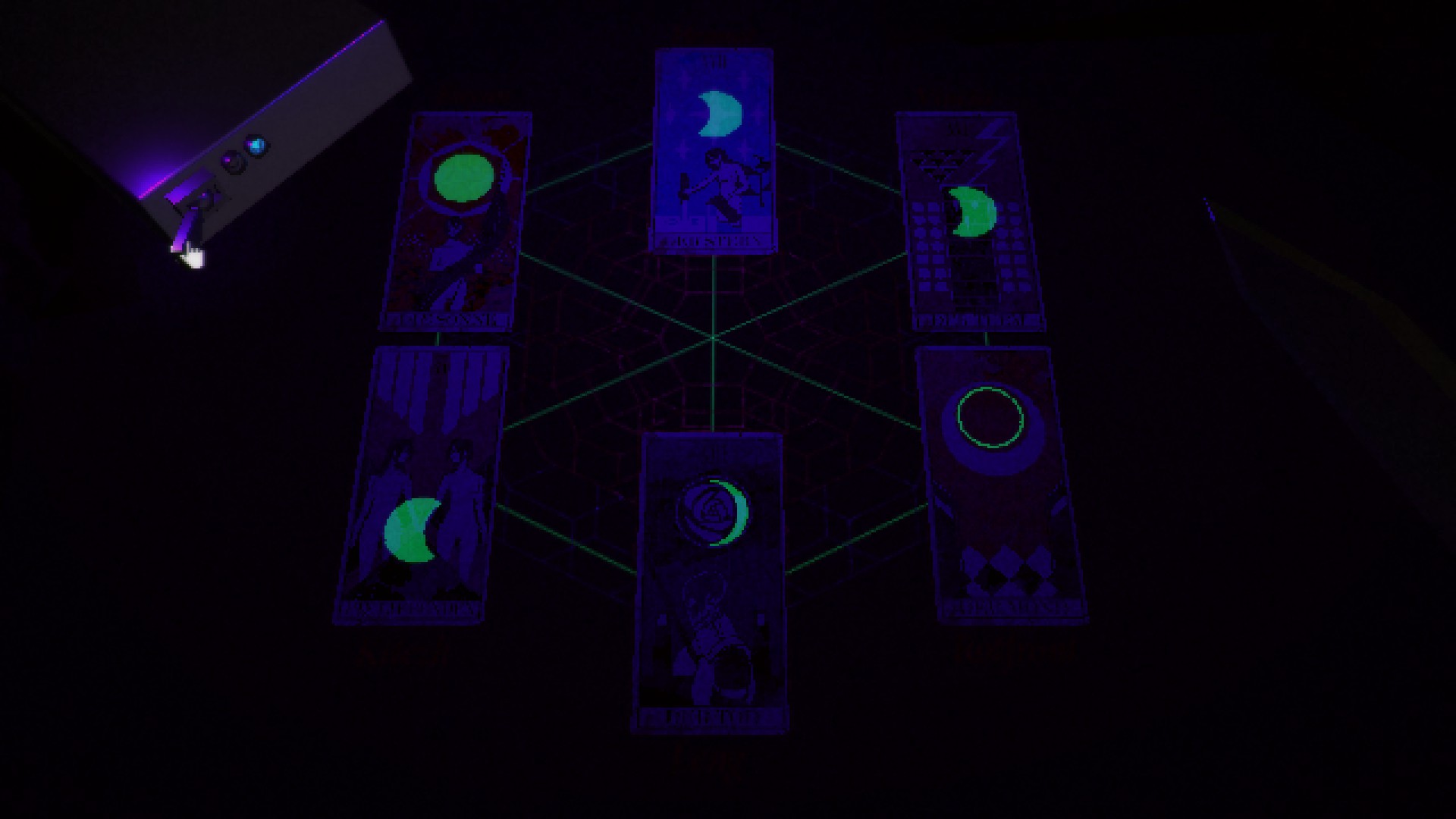 모니터 너머로 육각형 형태로 배치된 비석과 제물들이 보이며, 그 비석 중 하나는 엘스터의 것으로 추측된다. 비석들의 중심부에는 형광색 유물(아티팩트=테서랙트)이 위치하고 있는데..